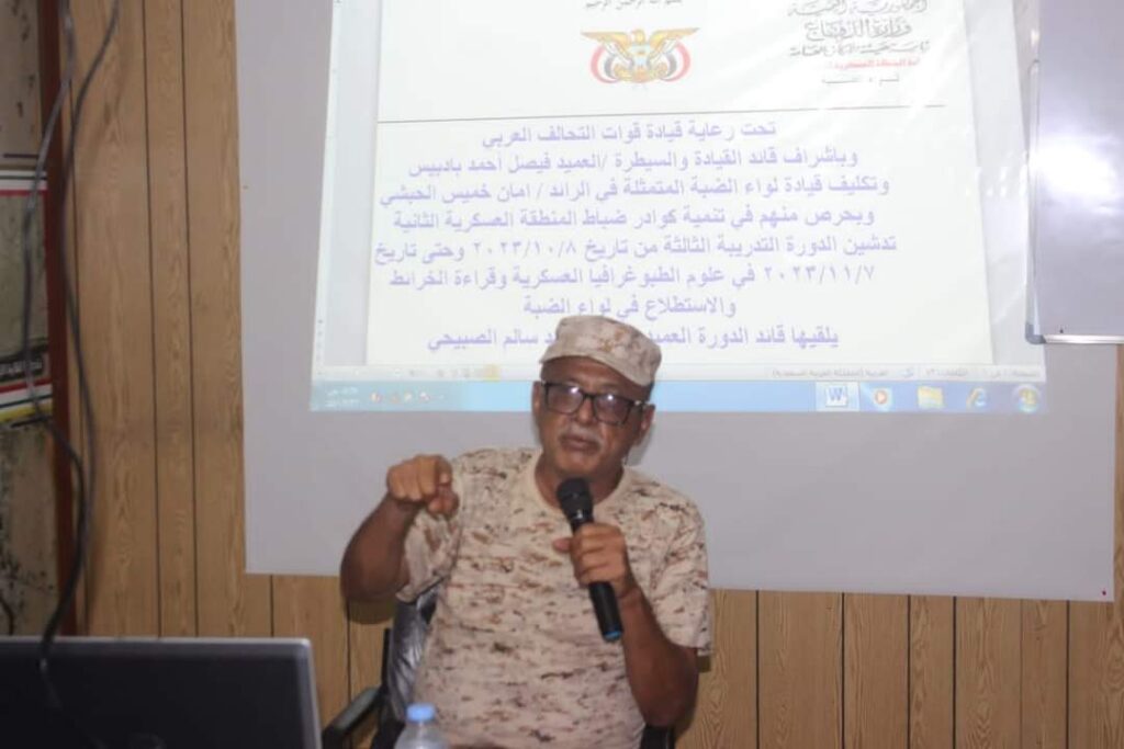 وأشاد الرائد الحبشي، بالمهارات والقدرات العالية للضباط المشاركين في دورة الطبوغرافيا العسكرية، مشدداً على ضرورة الاستفادة القصوى من المعلومات التي يختزنها الخبير في مجال الخرائط العسكرية العميد ركن محمد الصبيحي.