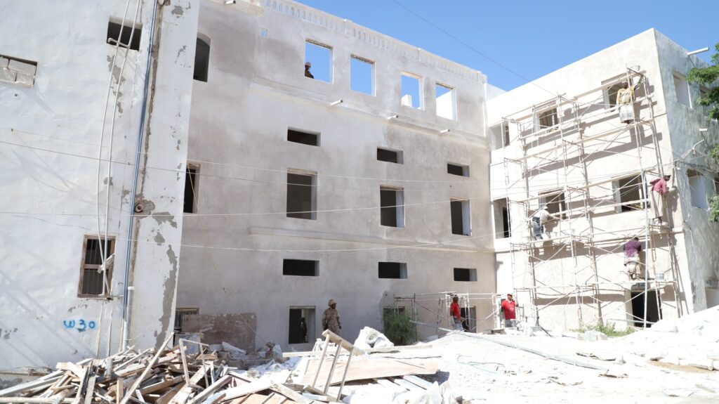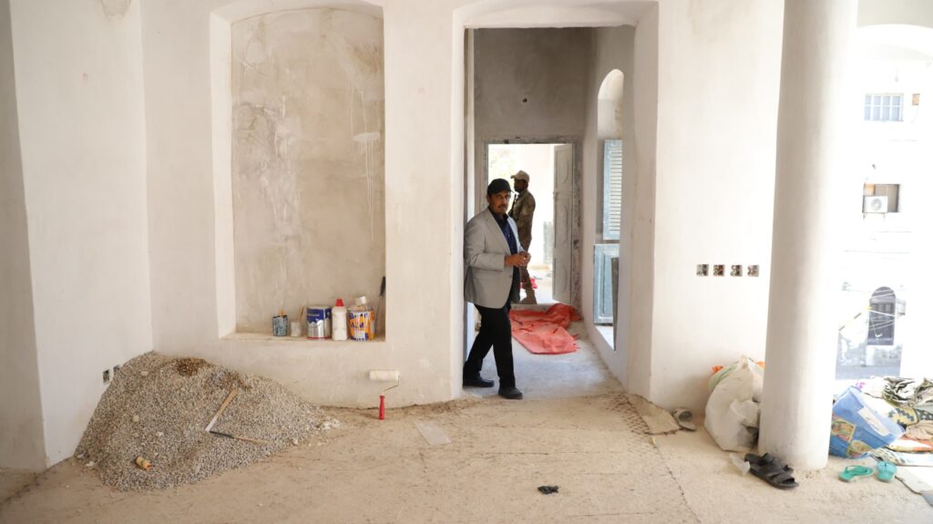 واطلع المحافظ على سير اعمال إعادة تأهيل مبنى ديوان المحافظة التي يتبناها عمّال بناء من مدينة تريم تحت اشراف مؤسسة دوعن للعمارة.