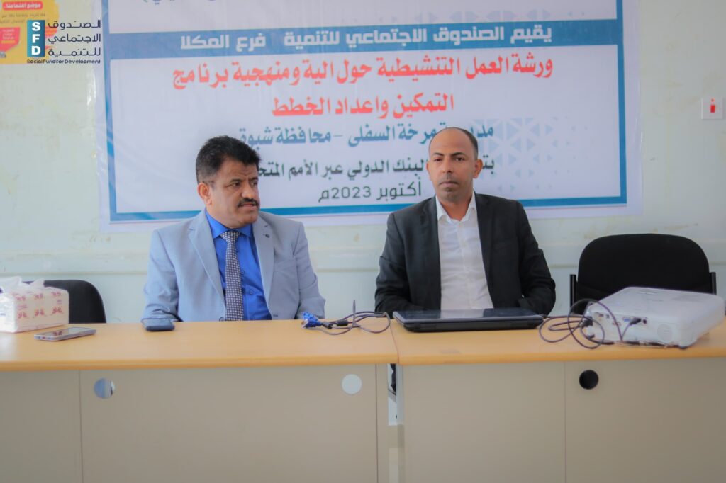 ضمن مشروع تفعيل وتحديد أولويات احتياجات المجتمع بالمشاركة لمنحة البنك الدولي السادسة (مشروع تكميلي)، دشّن الدكتور عوض سالم لقصم مدير الصندوق الاجتماعي للتنمية فرع المكلا صباح اليوم ورشة العمل التنشيطية حول آلية ومنهجية برنامج التمكين واعداد الخطط، والذي يستهدف مديرية مرخه السفلى بمحافظة شبوة.