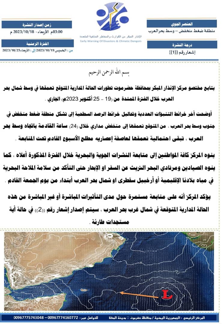 ينوه المركز كافة المواطنين إلى متابعة النشرات الجوية والبحرية خلال الفترة المذكورة أعلاه ، كما ينوه الصيادين ومرتادي البحر التريث عن السفر او الإبحار حتى التأكد من سلامة الملاحة البحرية في مياه بلادنا الإقليمية أو أرخبيل سقطرى او شمال بحر العرب أبتداء من يوم الجمعة القادم . يؤكد المركز أنه على متابعة مستمرة حول مدى التأثيرات المباشرة أو غير المباشرة من هذه الحالة المدارية المتوقعة في شمال غرب بحر العرب ، سيتم إصدار إشعار رقم ((2)) في حالة أية مستجدات طارئة .