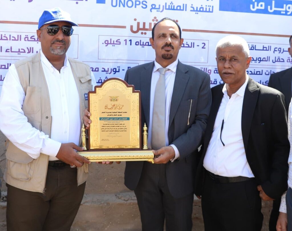 وقام محافظ حضرموت خلال زيارته لمديرية الشحر بتسليم المقاولين مشاريع في قطاع الطرق لإعادة تأهيل وسفلتة 5 كيلومتر من شوارع المدينة بتمويل من UNOPS.
