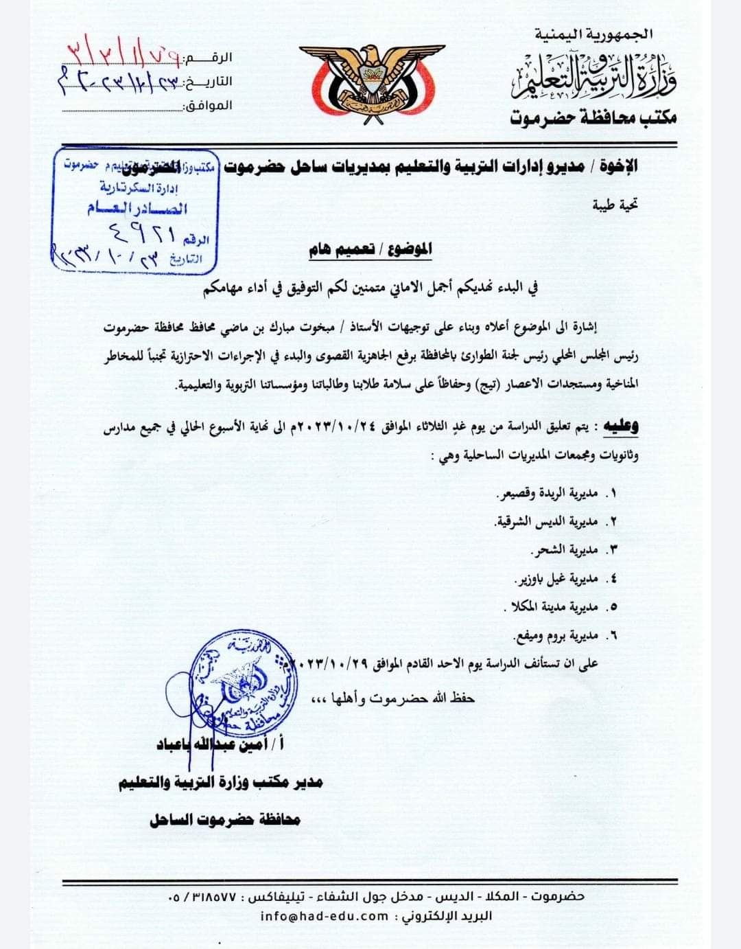تعليق الدراسة بساحل حضرموت من يوم غداً الثلاثاء الى نهاية الأسبوع الحالي تجنباً للمخاطر المناخية و مستجدات إعصار ( تيج )