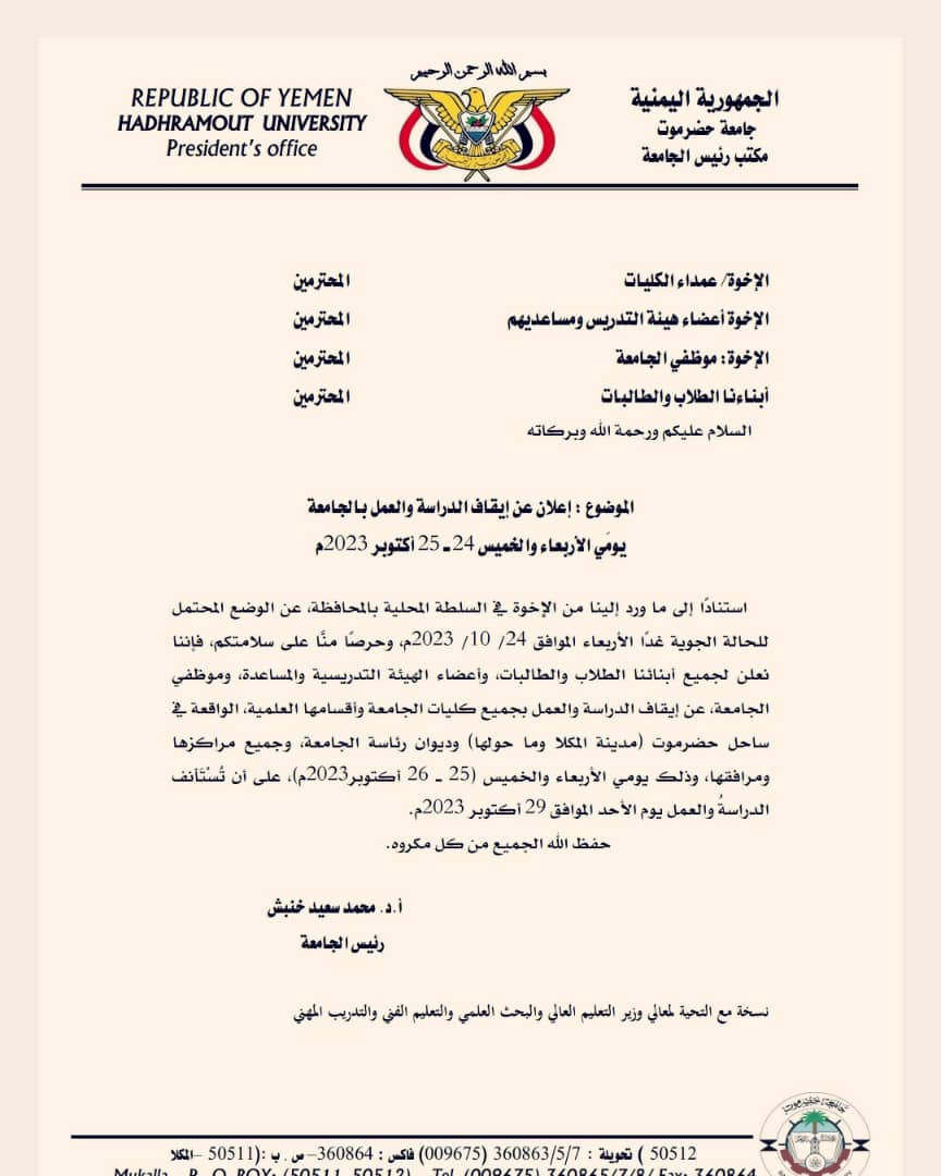 جامعة حضرموت تعلن إيقاف الدراسة في جميع كلياتها ليومي الأربعاء والخميس بسبب إعصار تيج.