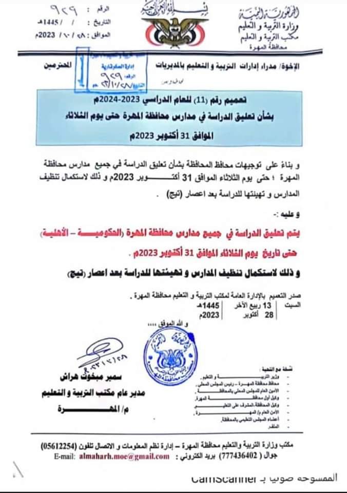 أعلن مكتب التربية والتعليم بمحافظة المهرة عن استئناف الدراسة في جميع مدارس المحافظة من يوم غدا الثلاثاء الموافق 31 أكتوبر، بعد إخلاء جميع المدارس التي وضعت ك مراكز للإيواء المتضررين اثناء ايام إعصار تيج.