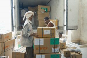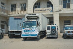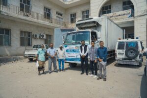 بعد ذلك تم تفريغ الشحنة من الأدوية والعلاجات والمستلزمات الطبية لمخازن مكتب الصحة والسكان بالمحافظة .