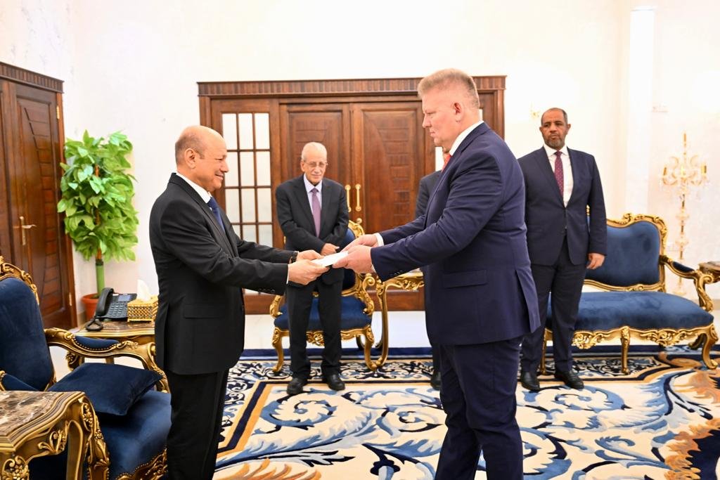 تسلم فخامة الرئيس الدكتور رشاد محمد العليمي، رئيس مجلس القيادة الرئاسي، اليوم الاربعاء، بقصر معاشيق في العاصمة المؤقتة عدن، اوراق اعتماد سفير جمهورية جنوب افريقيا غير المقيم موغوبو ديفيد موخابي، وسفير جمهورية بولندا غير المقيم روبرت روتسيك.