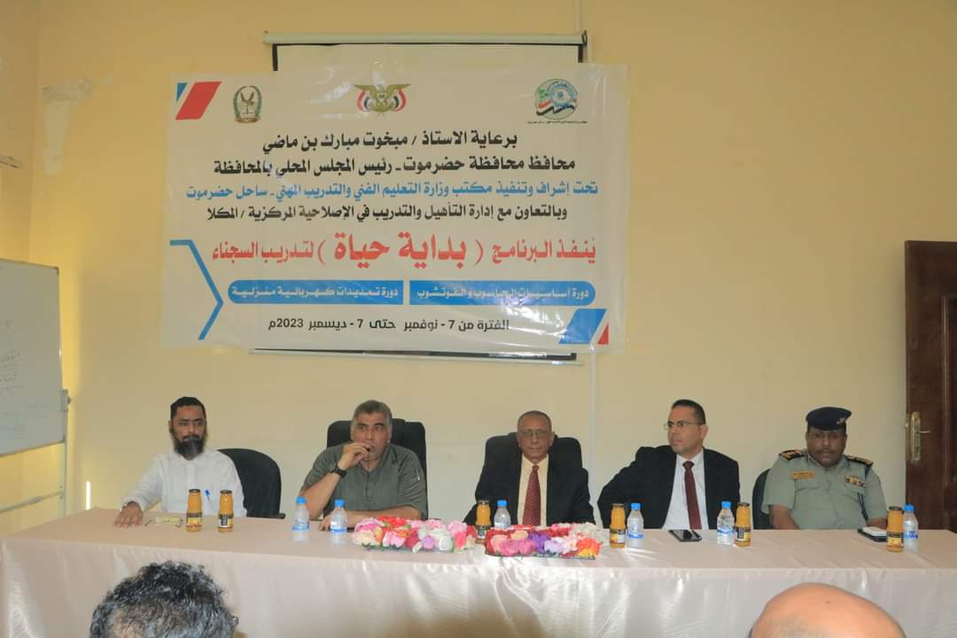 وخلال التدشين، الذي حضره مدير عام الرعاية والتأهيل بمصلحة السجون بوزارة الداخلية، العقيد عبدالوهاب شكري، ومدير مكتب وزارة التعليم الفني والتدريب المهني، الدكتور سالم باجابر، ومدير مكتب الشباب والرياضة الأستاذ حسن مسجدي، ومساعد مدير عام الأمن والشرطة لشؤون الخدمات، العقيد مرعي باخلعة، ورئيس اللجان المجتمعية بالمكلا، الأستاذ عبدالله بن علي الحاج، ومدير الإصلاحية المركزية، العقيد علي بازبيدي، أكد العميد المنهالي أهمية البرنامج لتمكين السجناء من تعلم المهارات المهنية والعلمية لكي يعودوا بالفائدة على ذواتهم ومجتمعهم بعد قضاء فترة السجن.
