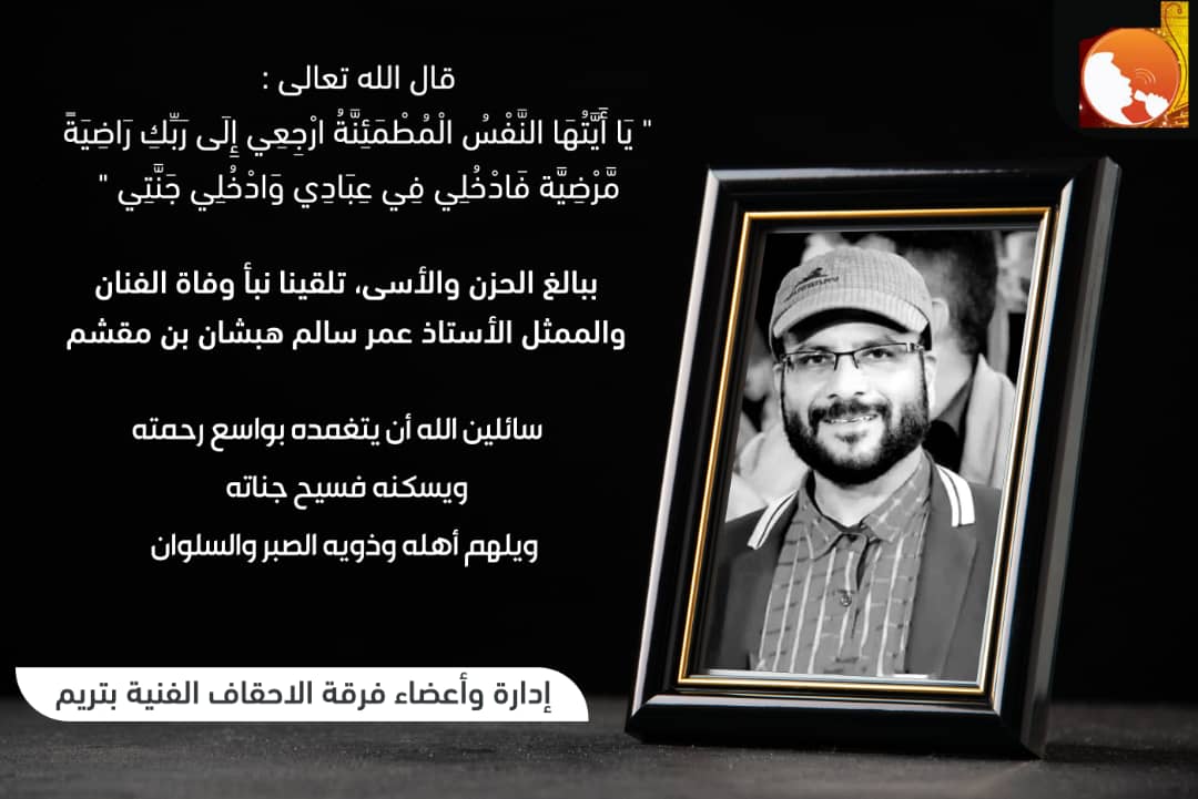 بعظيم الأسى والحزن ، تلقينا نبأ وفاة الفنان زميلنا ورفيق دربنا منذ تأسيس فرقة الأحقاف الفنية في العام 1990 وأحد أعمدة الفن الهادف الممثل والشاعر والملحن والمنولوجست الأستاذ عمر سالم هبشان بن مقشم ، الذي وافاه الأجل اليوم الأربعاء 2023.11.8م.