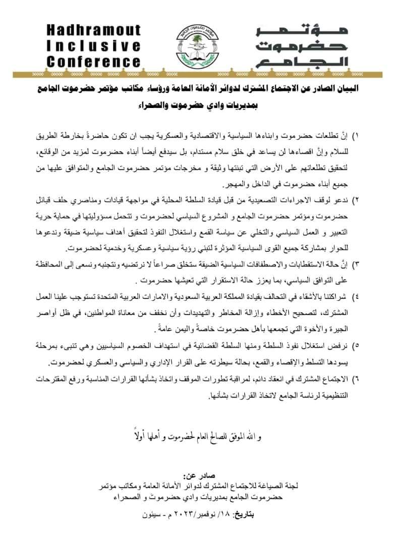البيان الصادر عن الاجتماع المشترك لرؤساء الدوائر ومكاتب الهيئات التنفيذية لمؤتمر حضرموت الجامع في مديريات الوادي والصحراء