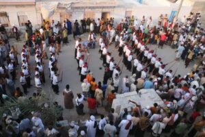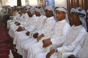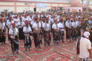 واستكملت مراسيم عقد القرآن، وزف بعدها العرسان إلى الساحة لتلقي المباركة وسط فرحة وسرور من جميع الحضور وفي ممر شرفي أقامتها فرقتي الملاح باطايع وفرقة العوش للألعاب الشعبية الذين شاركوا في فعاليات الزواج الجماعي بتقديم رقصة العدة التي تشتهر بها مدينة الحامي.