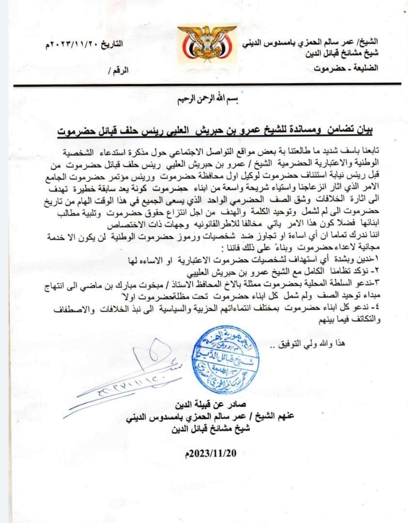 وقال بيان صادر عن الشيخ عمر سالم الحمزي بامسدوس الديني شيخ مشايخ قبائل الدين : (تابعنا بأسف شديد ما طالعنا به بعض مواقع التواصل الاجتماعي حول مذكرة استدعاء الشخصية الوطنية والاعتبارية الحضرمية الشيخ عمرو بن حبريش العليي رئيس حلف قبائل حضرموت من قبل رئيس نيابة استئناف حضرموت).
