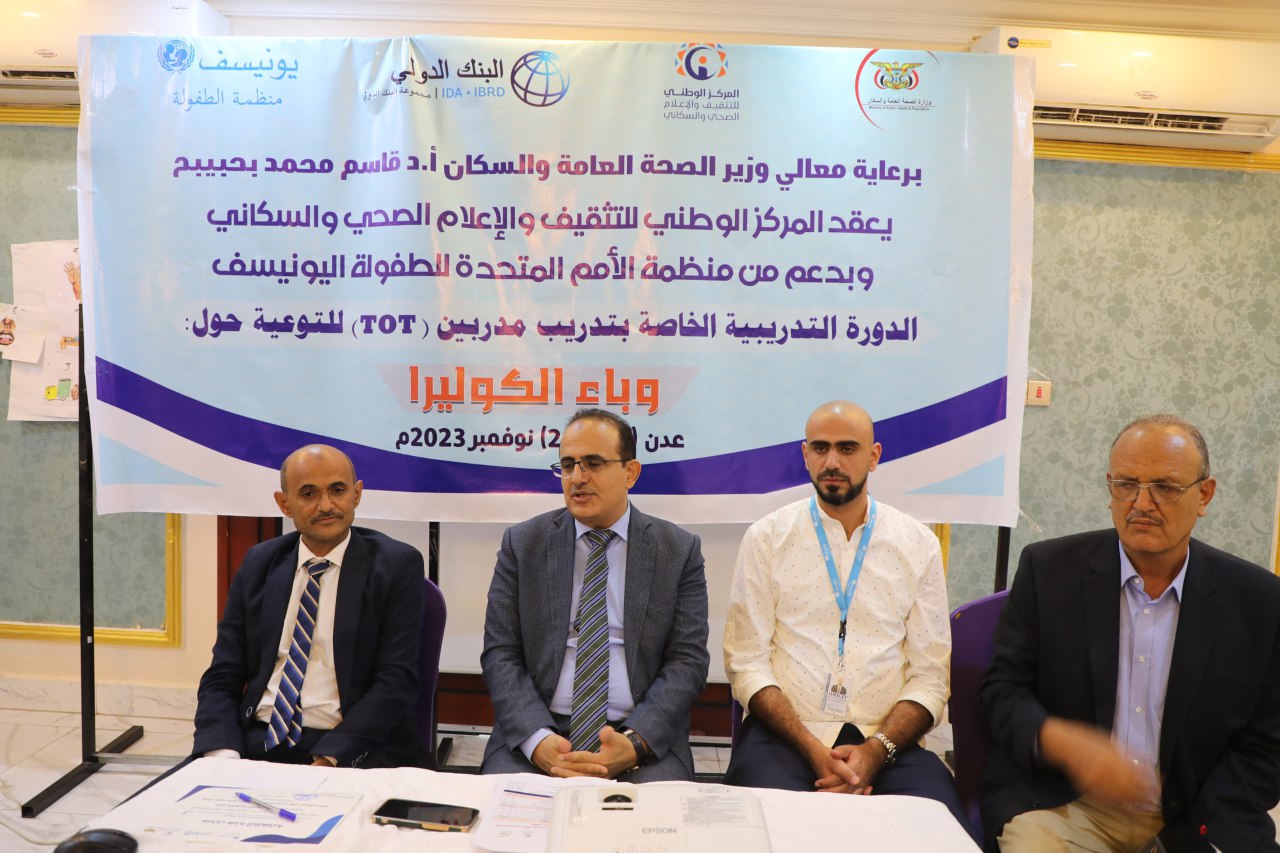 وأشار بحيبح في ختام دورة تدريب المدربين tot للتوعية حول وباء الكوليرا التي اختتمت اليوم، بالعاصمة المؤقتة عدن، إلى دور المركز الوطني للتثقيف والإعلام الصحي والسكاني في إيصال الرسائل التوعوية للمجتمع للوقاية من الأمراض..موضحا أهمية المسؤولية الجماعية للدفع والتحفيز، والاستفادة من شبكة المتطوعات والقابلات المجتمعية في نشر الوعي الصحي والمفاهيم التوعوية السليمة.