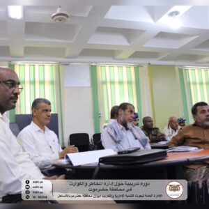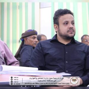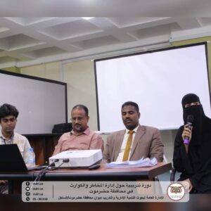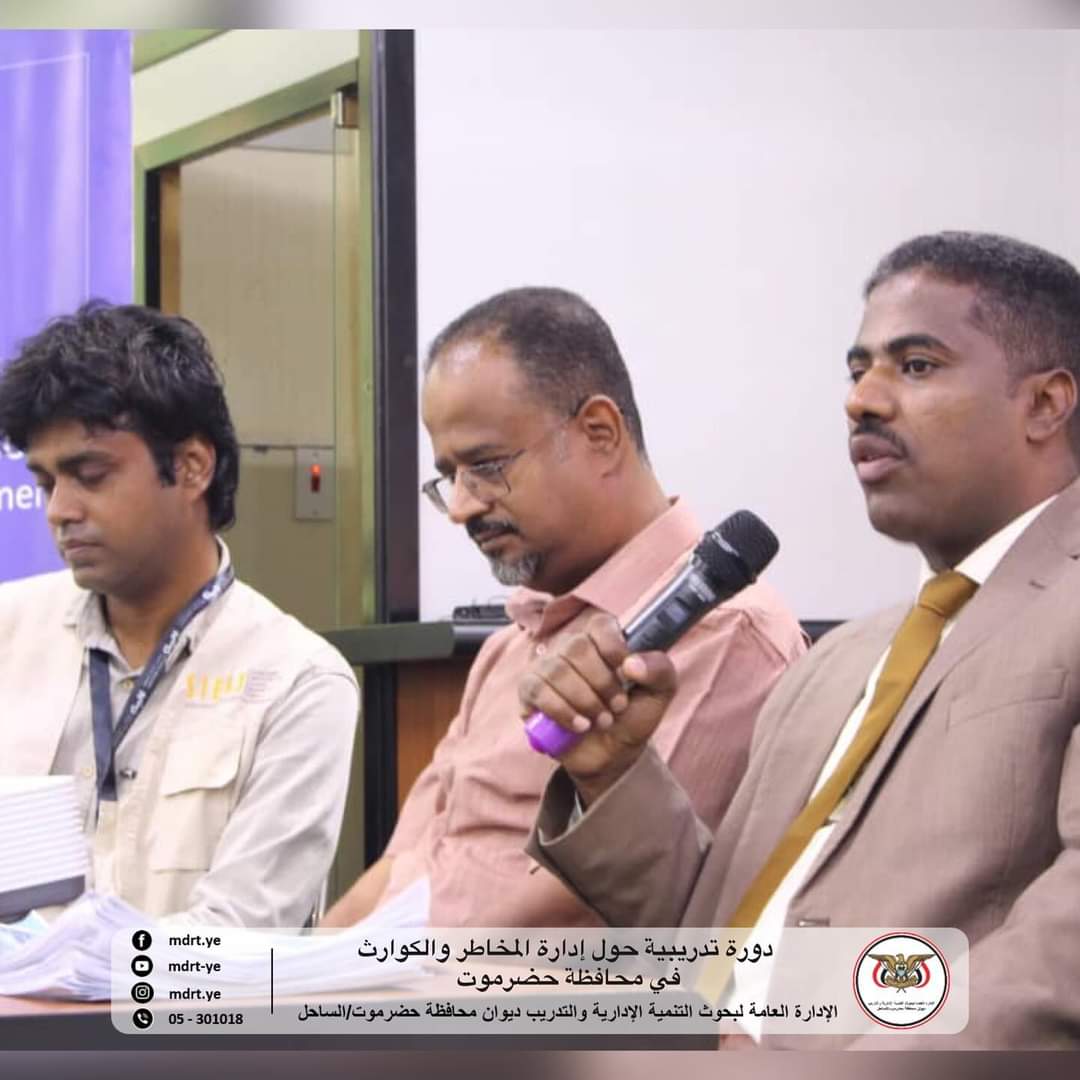 دشن وكيل حضرموت المساعد الأستاذ فهمي عوض باضاوي بمعية المدير العام للإدارة العامة لبحوث التنمية الإدارية والتدريب بساحل حضرموت الدكتورة مارينا عوض الجوهي ،اليوم ،بمدينة المكلا ، دورة تدريبية حول ( إدارة المخاطر والكوارث للسلطة المحلية بمحافظة حضرموت )