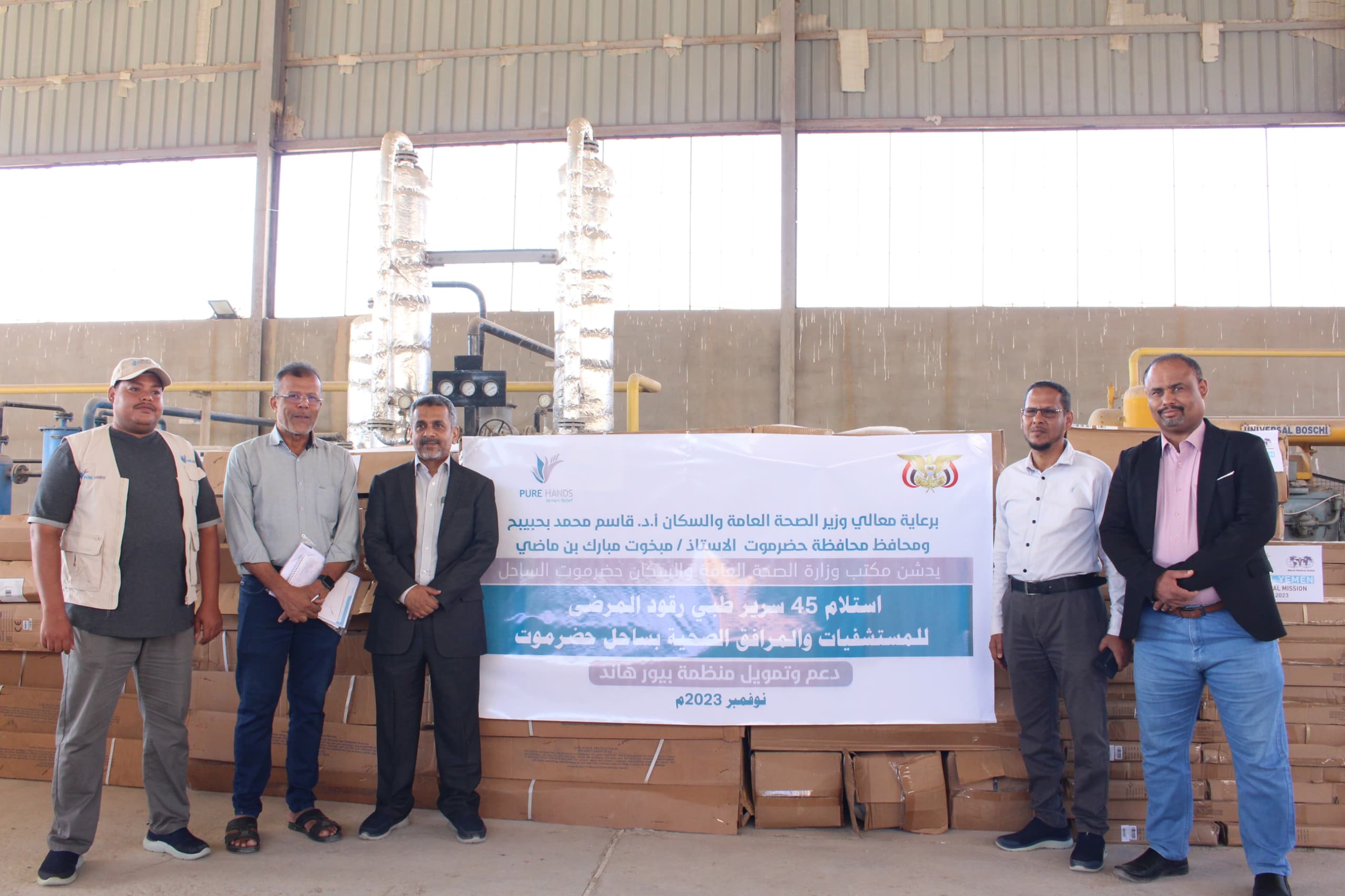 دشن كل من وكيل محافظة حضرموت للشئون المالية و الإدارية الدكتور أحمد سالم باصريح ، والدكتور محمد صالح الجمحي المدير العام لمكتب وزارة الصحة العامة والسكان بحضرموت الساحل بحضور مندوب منظمة بيوهاندز الدولية ، استلام عدد 45 سرير طبي رقود للمستشفيات و المرافق الصحية مقدمة من منظمة بيورهاندز الدولية ، وذلك بالتنسيق مع مؤسسة آفاق للتنمية ، وبرعاية كريمة من معالي وزير الصحة العامة والسكان أ.د. قاسم محمد بحيبح ومحافظ محافظة حضرموت