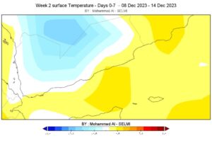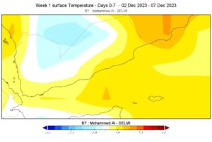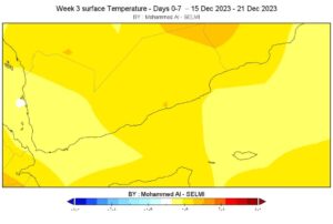 من خلال البيانات العددية الموضحة من خلال المحاكاة تبين تعمق الكتلة الباردة “موجة البرد” على مناطق صحاري حضرموت ومأرب و شبوة و مرتفعات ساحل حضرموت.