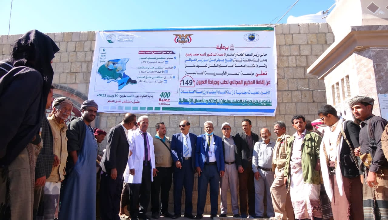 ويهدف المخيم، على مدى اسبوع، اجراء التدخلات الجراحية لازالة المياه البيضاء وتركيب العدسات لمرضى العيون في مديريات نصاب وعتق و الصعيد.