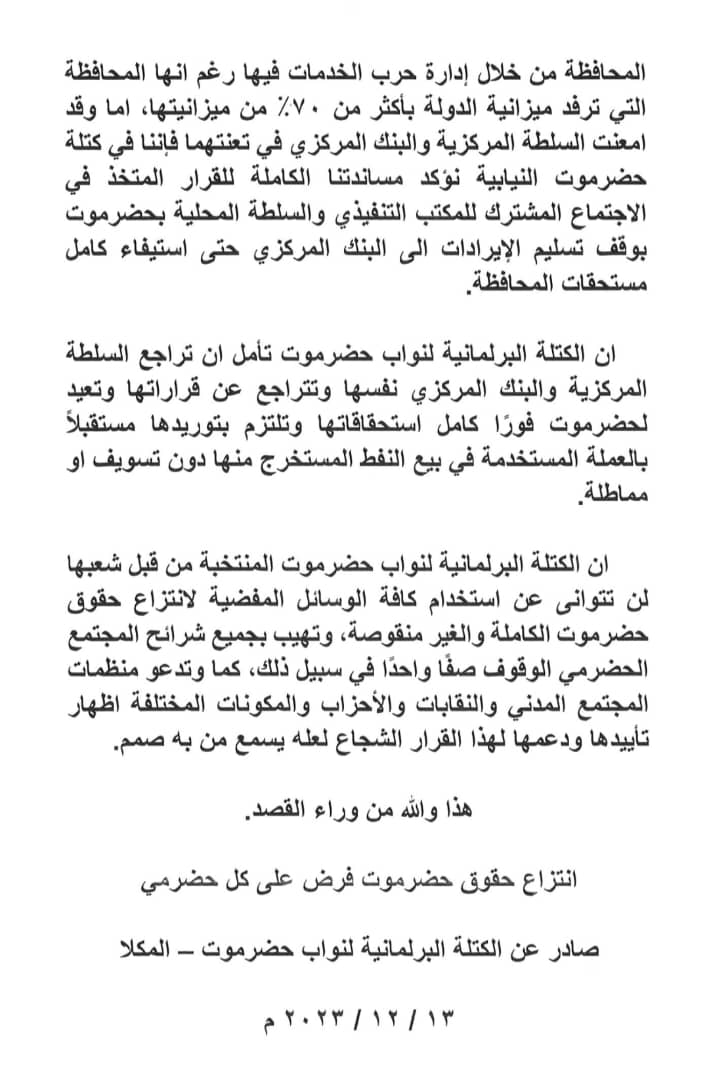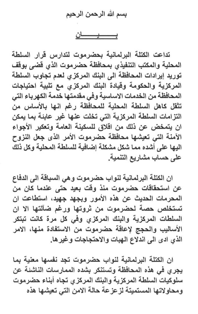 ان الكتلة البرلمانية لنواب حضرموت تجد نفسها معنية بما يجري في هذه المحافظة وتستنكر بشده الممارسات الناشئة عن سلوكيات السلطة المركزية والبنك المركزي تجاه أبناء حضرموت ومحاولاتها المستميتة لزعزعة حالة الامن التي تعيشها هذه المحافظة من خلال إدارة حرب الخدمات فيها رغم انها المحافظة التي ترفد ميزانية الدولة بأكثر من 70% من ميزانيتها، اما وقد امعنت السلطة المركزية والبنك المركزي في تعنتهما فإننا في كتلة حضرموت النيابية نؤكد مساندتنا الكاملة للقرار المتخذ في الاجتماع المشترك للمكتب التنفيذي والسلطة المحلية بحضرموت بوقف تسليم الإيرادات الى البنك المركزي حتى استيفاء كامل مستحقات المحافظة.