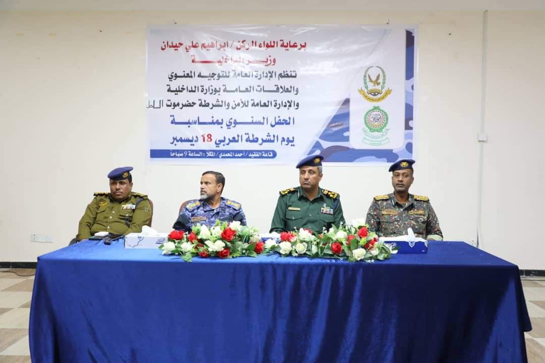 احتفت الإدارة العامة للأمن والشرطة بساحل حضرموت، صباح اليوم الأربعاء، باليوم العربي للشرطة الذي يصادف 18 من ديسمبر من كل عام، بحضور نائبي مدير عام الأمن والشرطة العميد عبدالعزيز الجابري، و العقيد صلاح المشجري، ومساعدي مدير عام الأمن والشرطة ومدراء الإدارات والمصالح، و جمعاً من الأفراد والضباط.