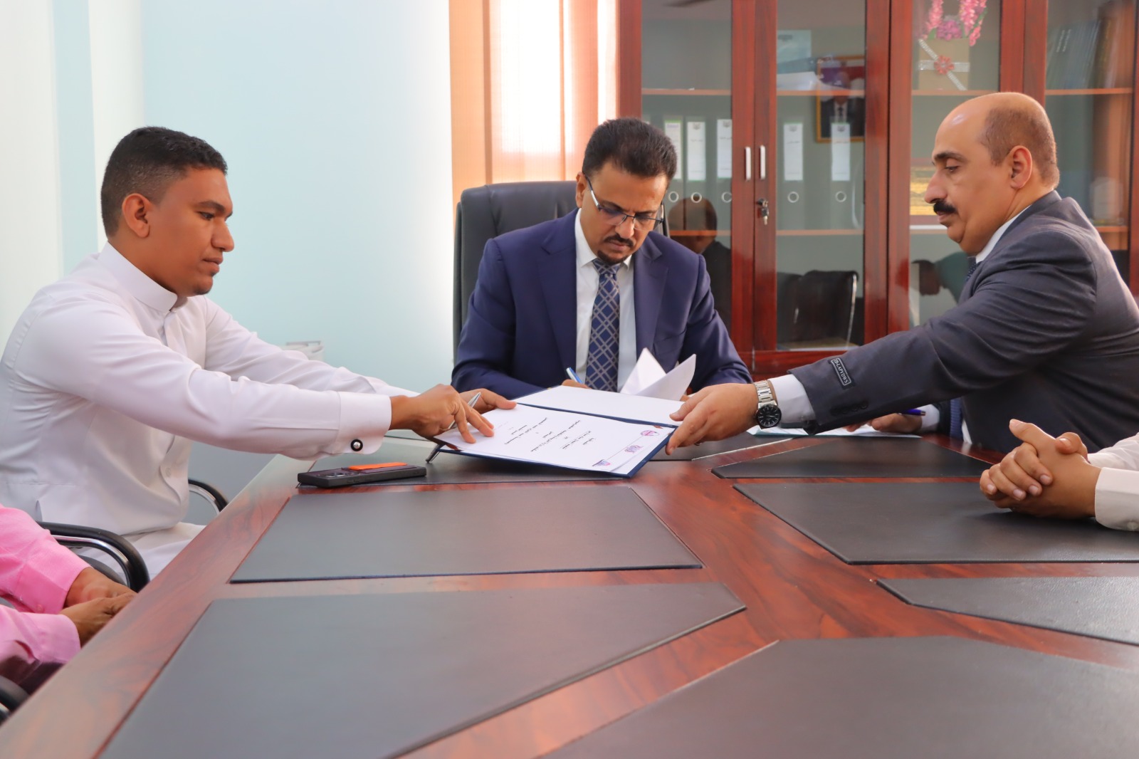 حضر توقيع الاتفاقية، الأستاذ عوض محمد بلفقيه مدير دائرة العلاقات العامة والشراكات بمكتب التربية والتعليم بساحل حضرموت، ومهندس مشاريع وصية عبد العزيز عبد المحسن الراشد المهندس محمد أحمد باعباد.