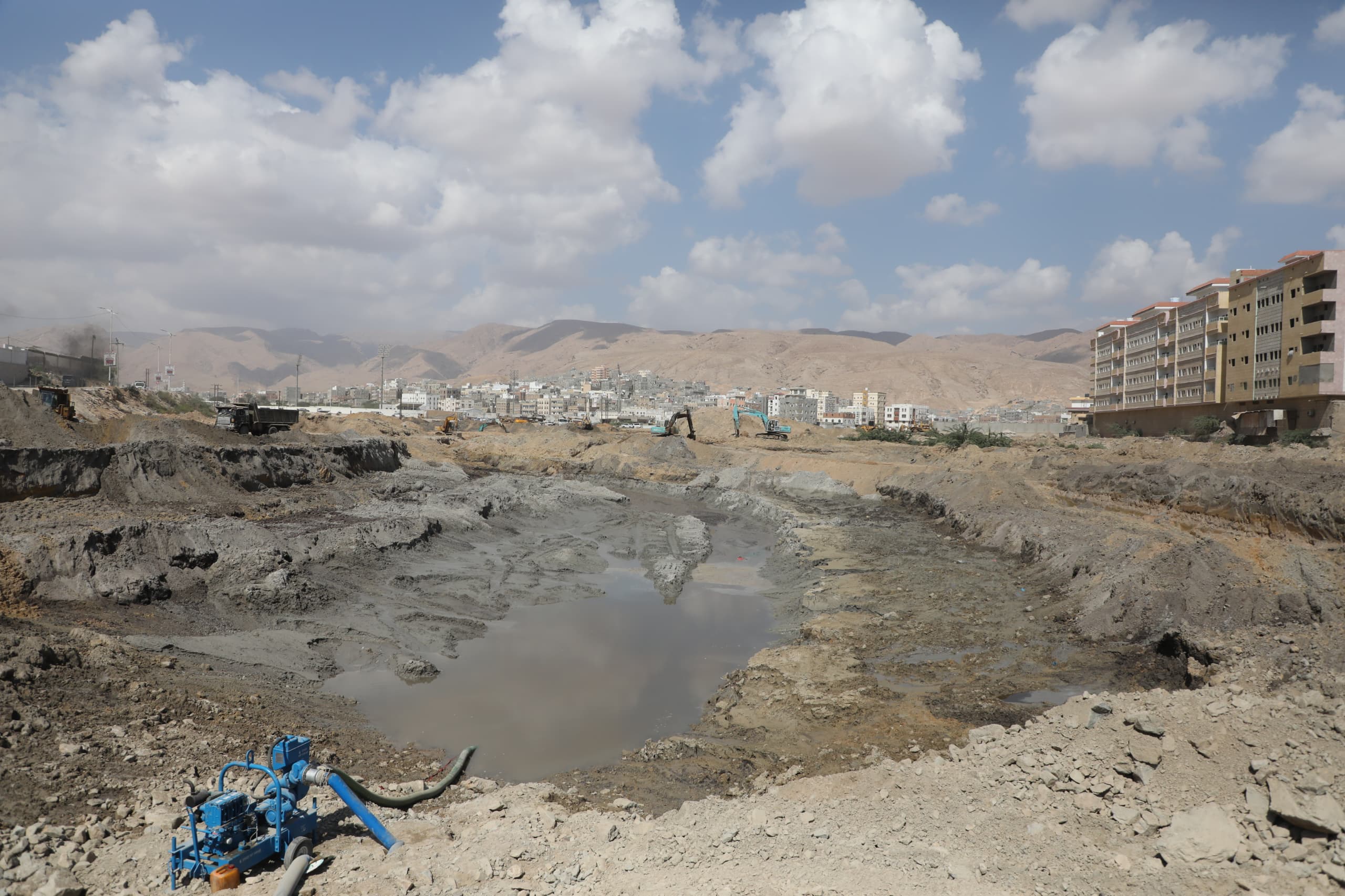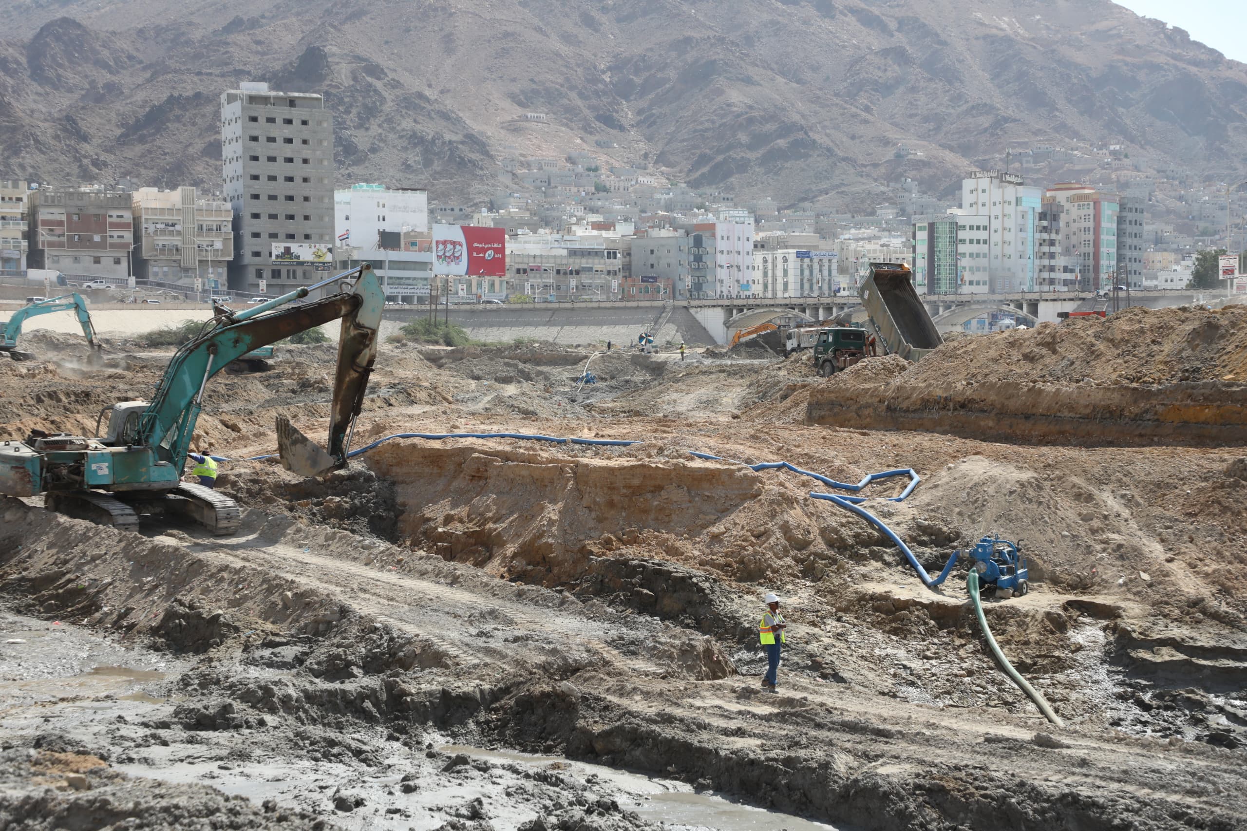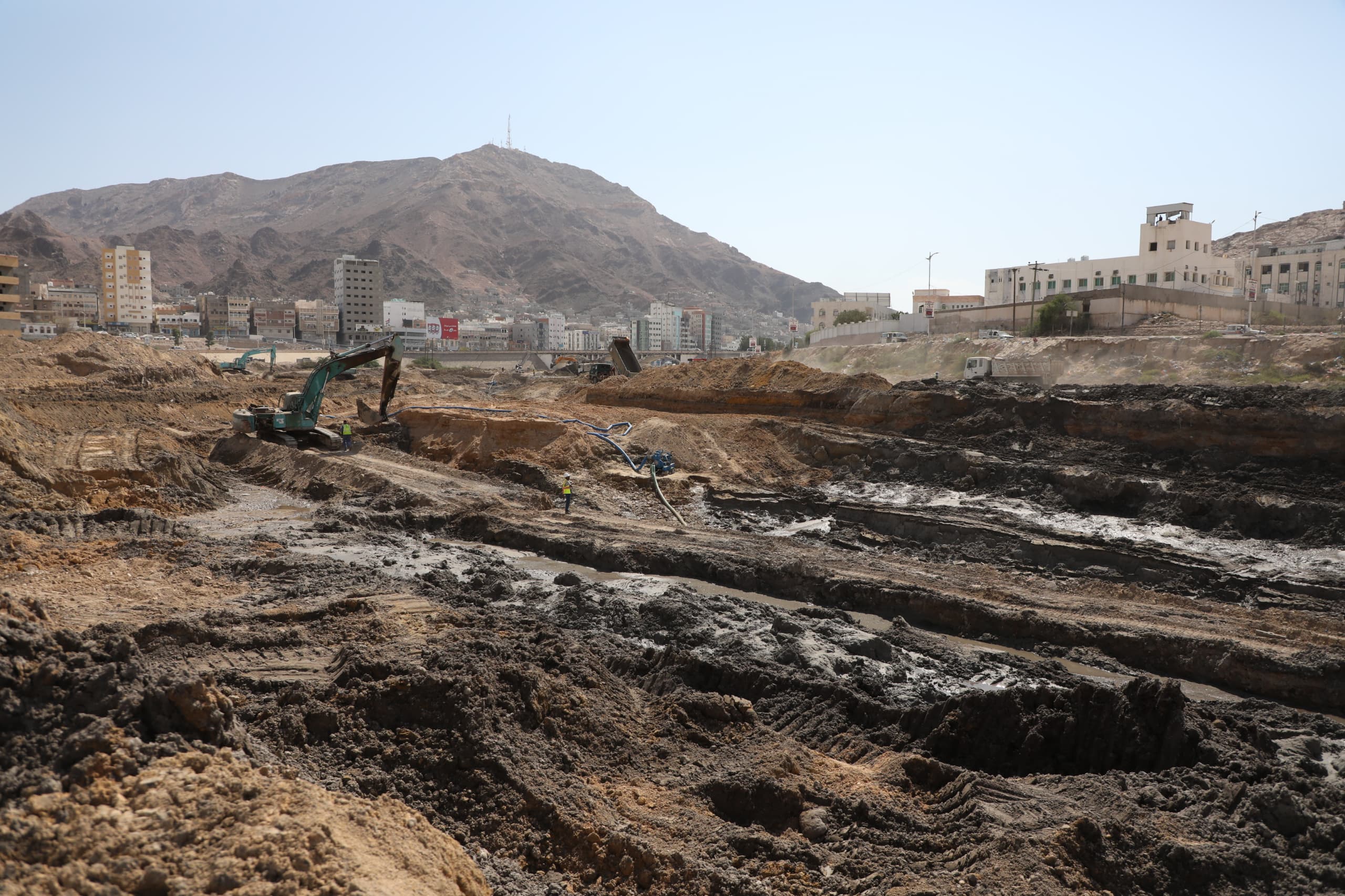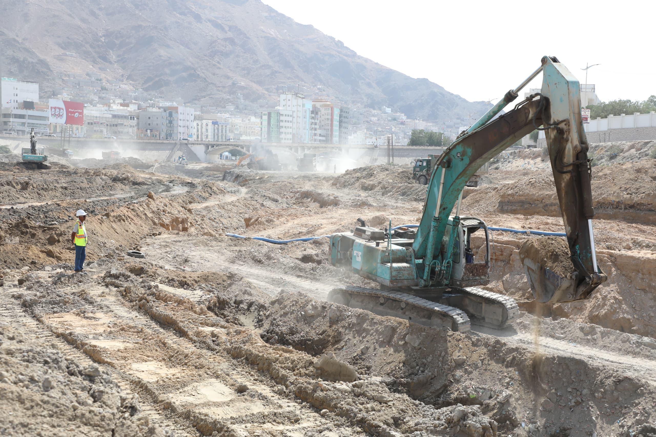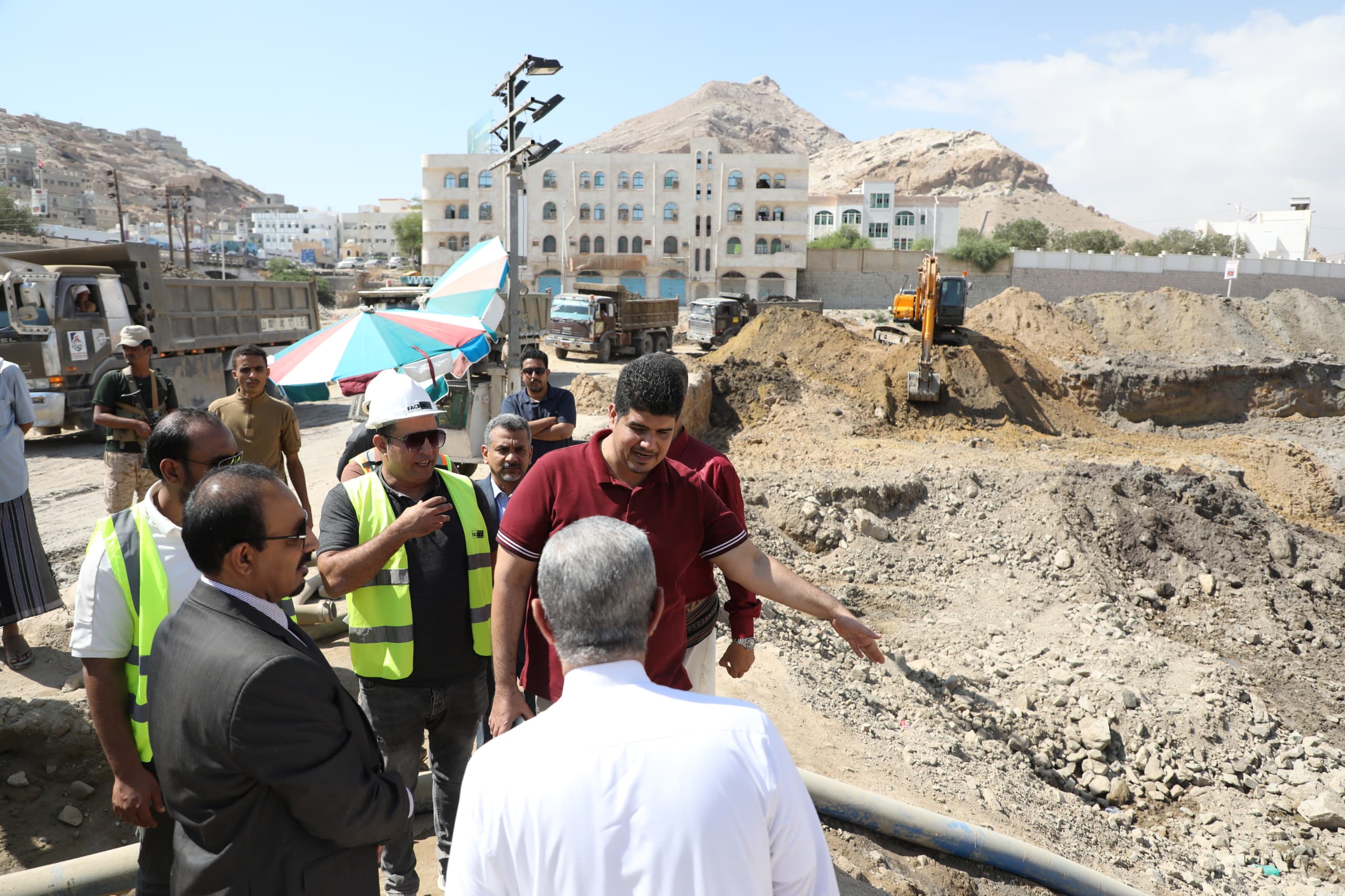 واطلع المحافظ ومعه وكيل المحافظة للشؤون المالية والإدارية الدكتور أحمد باصريح، على أعمال الحفر التي تنفذها مجموعة العمودي اليمنية للمقاولات والتجارة المحدودة، وتشمل الحفر على مستويات بداية من منسوب (5.00+) إلى منسوب (3.00+) ثم إلى منسوب (1.20+) ومنه إلى منسوب (0.00)، فيما يجري الحفر إلى منسوب (2.00-) عند جسر المنورة والجسر الصيني، الى جانب أعمال الحفر التي تجاوزت 90.000 متر مكعب بنسبة 20% من إجمالي الحفريات، بالإضافة ألى أعمال نزح المياه الجوفية أثناء الحفر، وإزاحة الخدمات العائقة للمشروع مثل الكهرباء والمجاري والمياه بالتعاون تحت اشراف السلطة المحلية بالمحافظة.