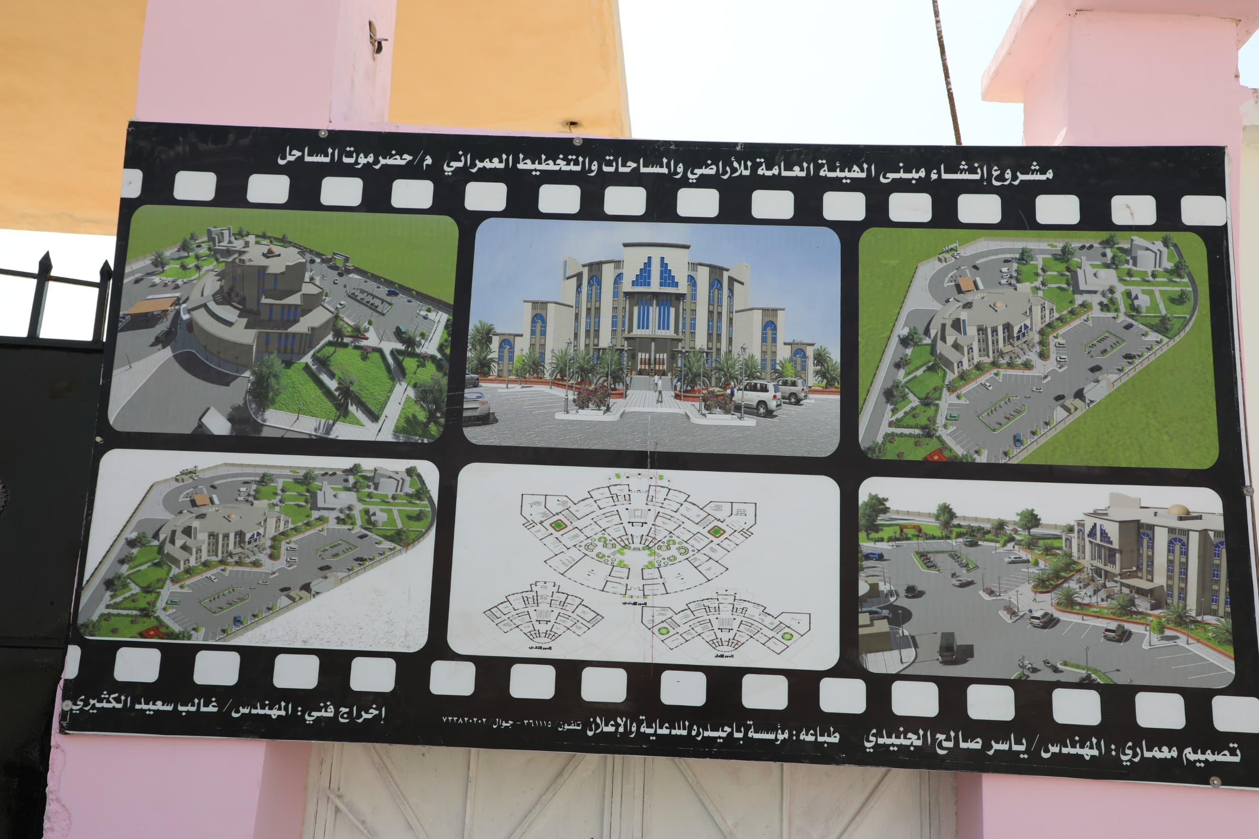 واستمع المحافظ ورئيس الهيئة، بحضور وكيل المحافظة للشؤون الفنية المهندس أمين سعيد بارزيق، والمدير العام لفرع الهيئة العامة للاراضي والمساحة والتخطيط العمراني بساحل حضرموت عبدالله حسن بن علي الحاج، الى شرح للتصاميم الفنية لمبنى فرع الهيئة التي تشمل مكاتب إدارية ومكاتب لإدارات قطاعات الأراضي والتخطيط والتوثيق والسجل العقاري ونظم الخرائط الجغرافية وقاعة للاجتماعات، الى جانب مواقف للسيارات ومساحات خضراء، بتمويل من الهيئة العامة للاراضي والمساحة والتخطيط العمراني.