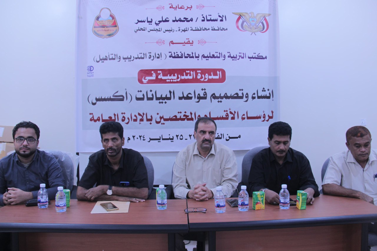 بدأت بمحافظة المهرة، اليوم، الدورة التدريبية في مجال إنشاء وتصميم قاعدة بيانات (اكسس) والتي ينظمها مكتب التربية والتعليم بالمحافظة لرؤساء الأقسام والمختصين بالإدارة العامة.