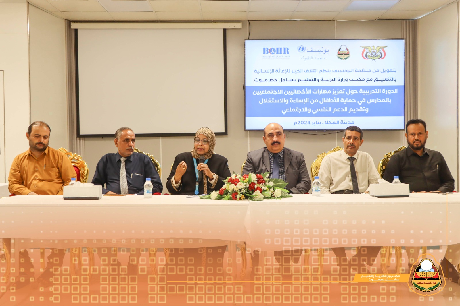 حضر الأستاذ/ أمين عبدالله باعبّاد مدير مكتب وزارة التربية والتعليم بمحافظة حضرموت الساحل بمعية الأستاذ/ علوي أحمد الحامد نائب المدير رئيس شعبة التدريب والتأهيل والأستاذ/ حسن سعيد الشنيني منسق منظمة اليونيسف بمكتب التربية والتعليم بالمحافظة مدير دائرة التدريب والتأهيل بالمكتب جانباً من الدورة التدريبية حول تعزيز مهارات الأخصائيين الاجتماعيين بالمدارس في حماية الأطفال من الإساءة والاستغلال وتقديم الدعم النفسي والاجتماعي بتمويل من منظمة اليونيسف وتنظيم ائتلاف الخير للإغاثة الإنسانية وبالتنسيق مع مكتب وزارة التربية والتعليم بمحافظة حضرموت الساحل .