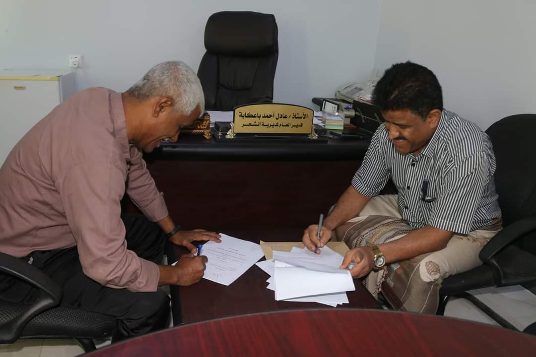 رعى الأستاذ عادل أحمد باعكابة المدير العام لمديرية الشحر التوقيع على مشروع تأهيل قنوات الري و البرك المكشوفة و استصلاح الاراضي الزراعية بمنطقة المعيان و المناطق المجاورة و منطقة تبالة