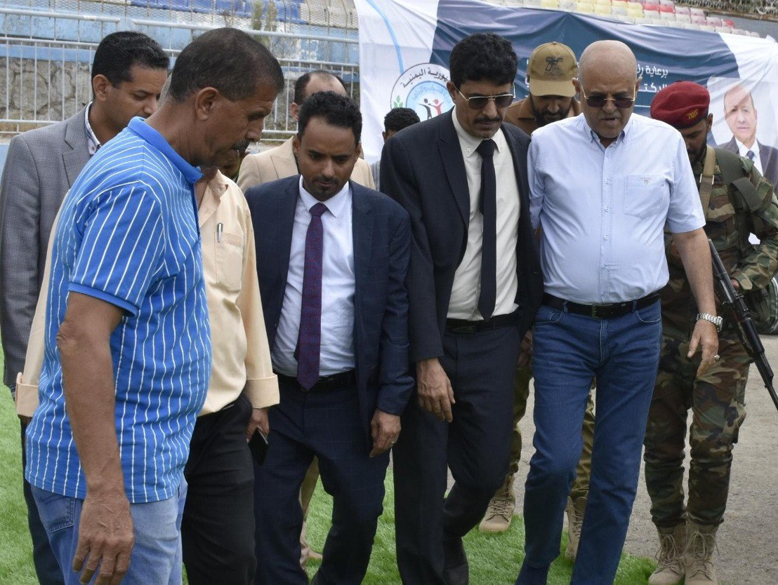 دشن محافظ تعز نبيل شمسان، اليوم، مشروع فرش العشب الصناعي لملعب الشهداء والنادي الأهلي.