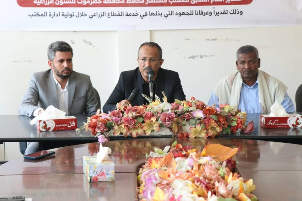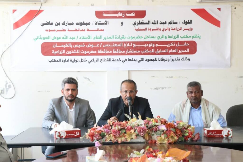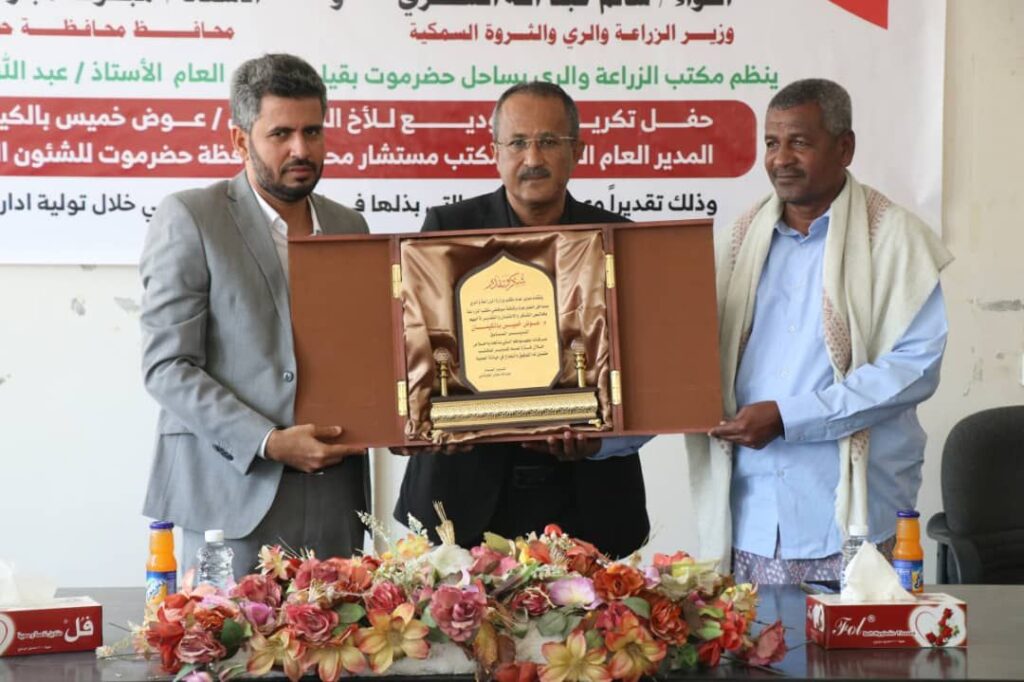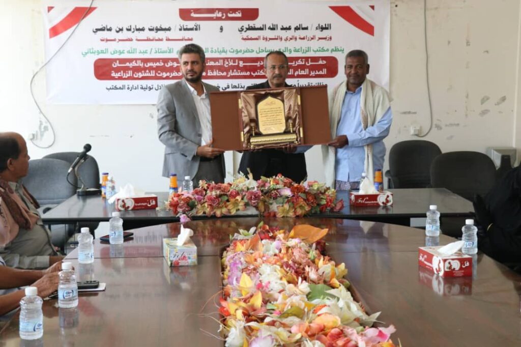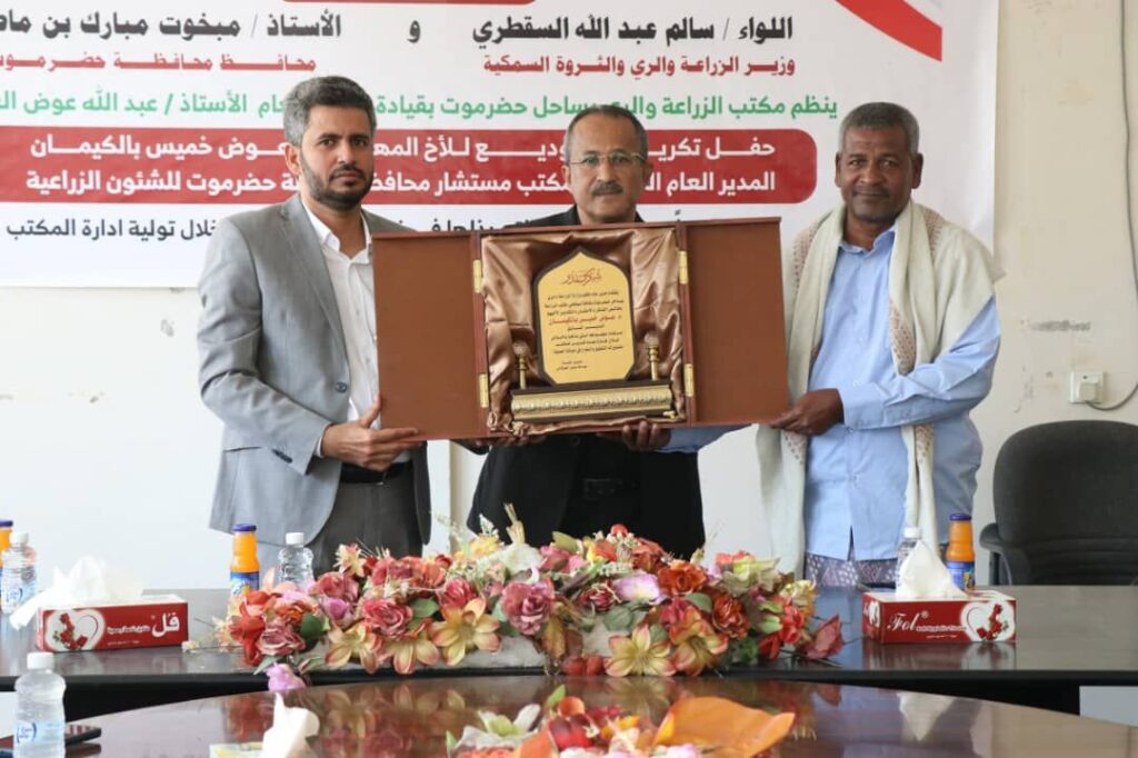 بحضور وكيل حضرموت للشؤون الفنية المهندس أمين سعيد بارزيق ، نظم مكتب وزارة الزراعة والري بساحل حضرموت ممثلاً بمدير عام المكتب الأستاذ عبدالله عوض العوبثاني صباح اليوم الأحد حفل تكريم وتوديع للمهندس عوض خميس بالكيمان المدير العام السابق للمكتب مستشار محافظ محافظة حضرموت للشؤون الزراعية ،برعاية كريمة من اللواء سالم عبدالله السقطري وزير الزراعة والري والثروة السمكية ومحافظ محافظة حضرموت الاستاذ مبخوت مبارك بن ماضي .