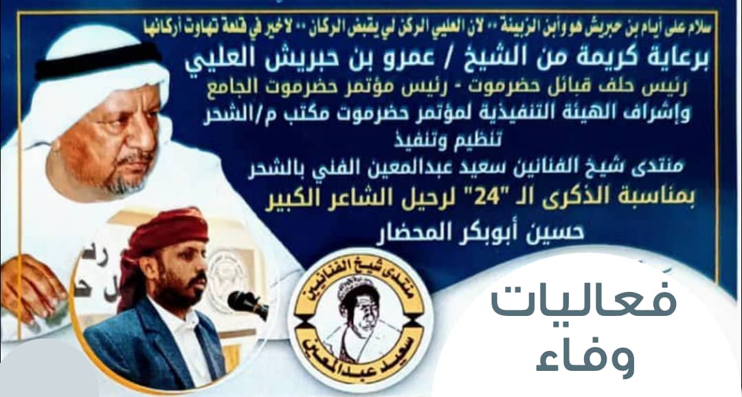 وتاتي هذه الفعاليات الوفائية لاستحضار ذكرى الشاعر الكبير الراحل حسين المحضار الـ 24 وما تركه من خصال إنسانية، و بصمات خالدة في الحياة الثقافية والفنية.
