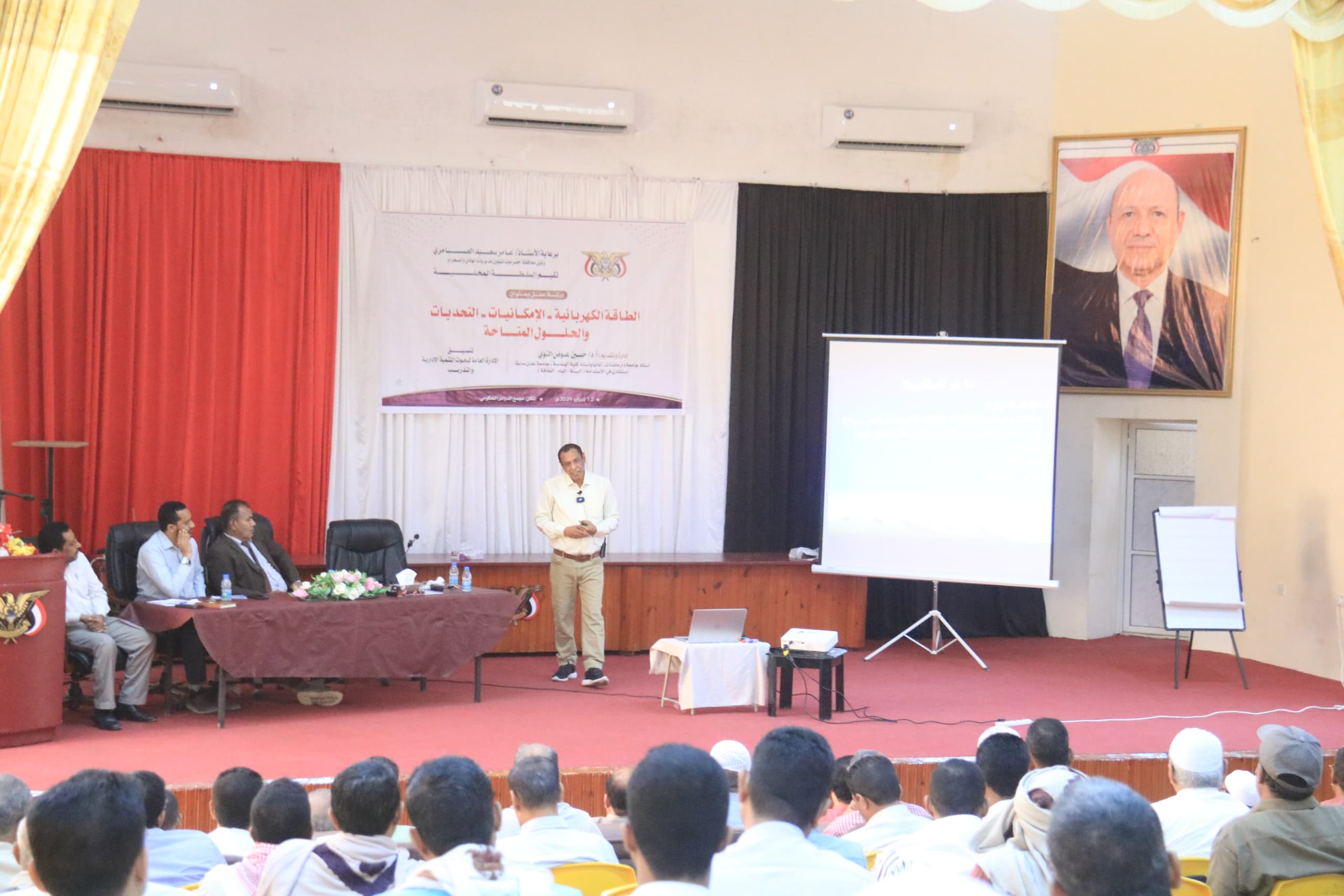 اقامت السلطة المحلية بوادي وصحراء حضرموت بالتنسيق مع الإدارة العامة لبحوث التنمية الإدارية والتدريب بديوان السلطة المحلية ورشة عمل بعنوان””الطاقة الكهربائية الامكانيات والتحديات والحلول المتاحة” والتي نفذها تحدث فيها البروفسور حسين التوي استشاري في الاستدامة البيئية والمياه والطاقة اسواذ بجامعة دارماشتات المانيا واستاذ كلية الهندسة بجامعة عدن.