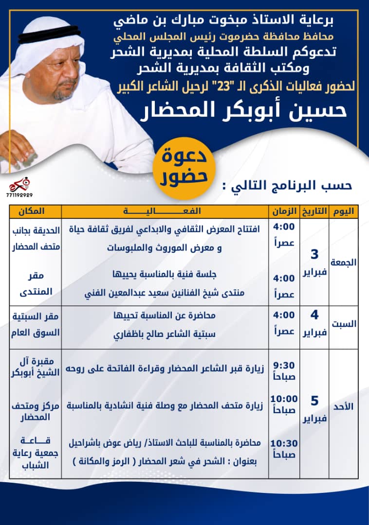 تنطلق يوم غد الجمعة فعاليات إحياء الذكرى الثالثة والعشرين لرحيل الشاعر والملحن الكبير حسين ابوبكر المحضار بمدينة الشحر برعاية محافظ حضرموت الأستاذ مبخوت مبارك بن ماضي وإشراف السلطة المحلية بمديرية الشحر وتنفيذ مكتب الثقافة بالمديرية.