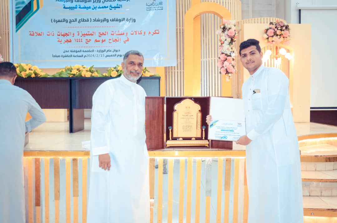 وان هذا التكريم من وزارة الاوقاف يأتي في سياق النجاحات التي حققتها الوكالات اليمنيه وتميزها في خدمة ضيوف الرحمن