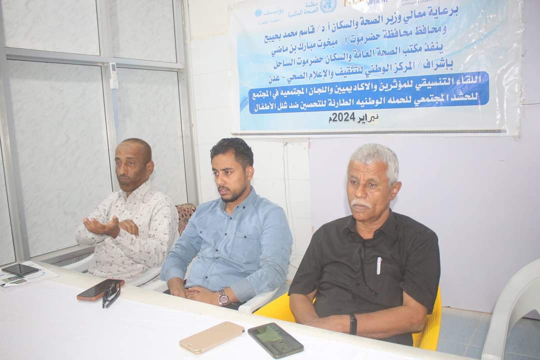 وفي اللقاء أكد المدير العام على أهمية تحصين الأطفال ، داعيا إلى ضرورة تظافر الجهود كافة لإنجاح برامج التحصين وتصويب المعلومات الخاطئة والمظللة التي تروج ضد برنامج التحصين الأمر الذي أدى إلى عودة ظهور بعض الأمراض الخطيرة في مجتمعنا ، مؤكد استعداد السلطة المحلية بالمديرية لتقديم كافة التسهيلات اللازمة لإنجاح برامج الحملة والأنشطة التي تسهم في نشر التوعية الصحية المجتمعية لمكافحة الأمراض والحميات والأوبئة الأخرى والحد من انتشارها في مديرية الشحر .