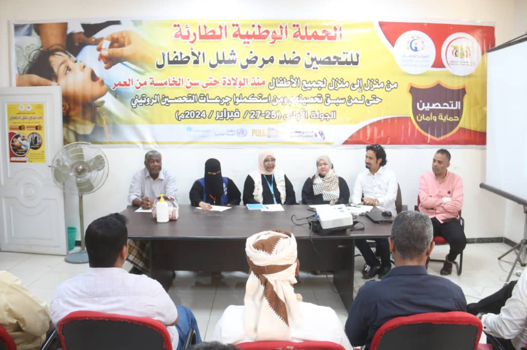 نظم مكتب وزارة الصحة العامة والسكان بحضرموت الساحل بمدينة المكلا اللقاء التنسيقي لمدراء مكاتب الصحة ومشرفي التحصين في المديريات حول الحملة الوطنية الطارئة للتحصين ضد مرض شلل الأطفال منذ الولادة حتى سن الخامسة من العمر الجولة الأولى للفترةة من 25-27 فبراير 2024م تحت شعار ,, التحصين حماية و أمان ,, التي تستهدف المناز والمواقع الثابتة والمتحركة ، بإشراف البرنامج الوطني الموسع للتحصين و المركز الوطني للتثقيف الصحي و الإعلام بالوزارة ، وذلك برعاية كريمة من محافظ محافظة حضرموت الأستاذ مبخوت مبارك بن ماضي ، ومعالي وزير الصحة العامة والسكان البروفسور قاسم محمد بحيبح بدعم من منظمتي الصحة العالمية و اليونيسيف .