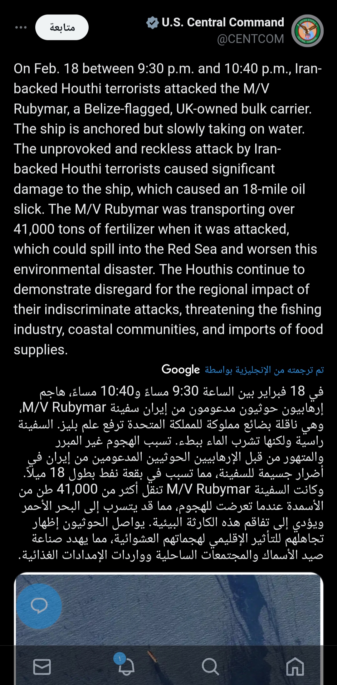 وأمس الجمعة، أعلنت القيادة المركزية الأمريكية أن استهداف الحوثيين للسفينة، الأحد الماضي، تسبب بتسرب نفطي في البحر الأحمر بطول 18 ميلا.