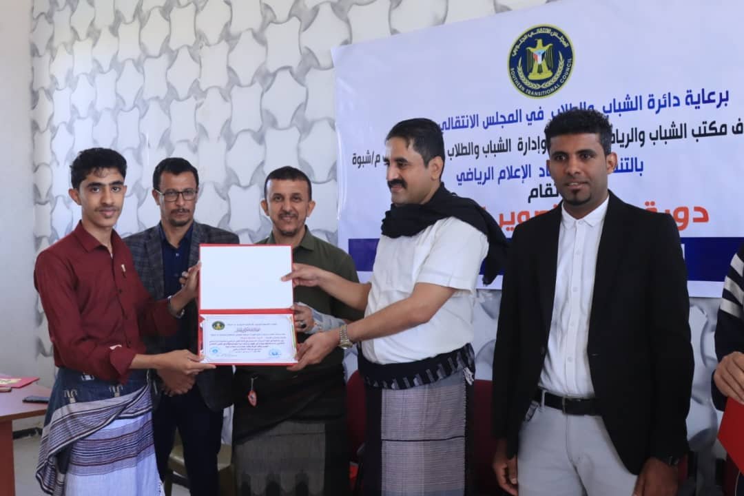 اختتم انتقالي محافظة شبوة، اليوم ، دورة التصوير الرياضي، برعاية دائرة الشباب والطلاب في الأمانة العامة لهيئة رئاسة المجلس الانتقالي، وتحت إشراف مكتب الشباب والرياضة بالمحافظة، بحضور العميد علي احمد الجبواني رئيس تنفيذية انتقالي المحافظة.