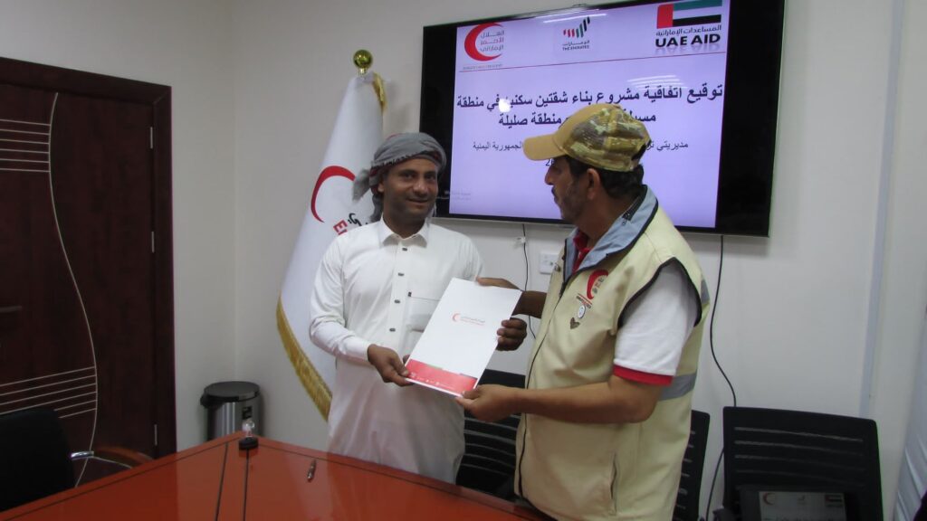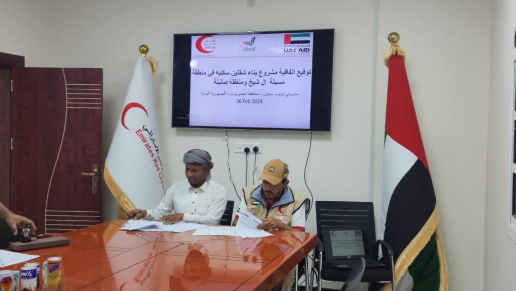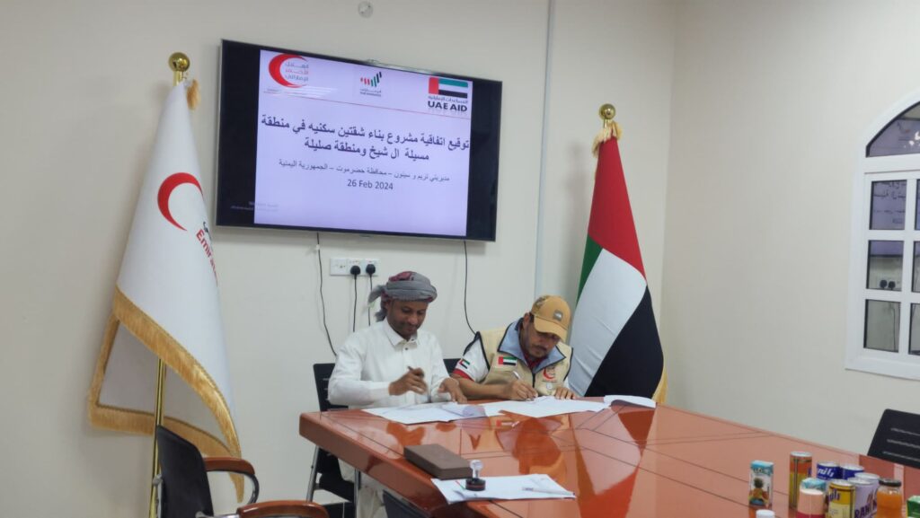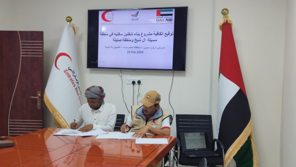 بدعم من دولة الإمارات العربية المتحدة، وقعت هيئة الهلال الأحمر الإماراتي يوم أمس إتفاقية جديدة لبناء شقتين سكنيتين لاسرتين محتاجتين في منطقة مسيلة آل الشيخ ومنطقة صليلة بمحافظة حضرموت