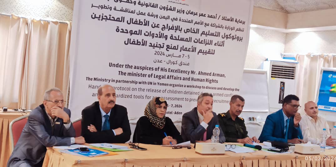 نظمت وزارة الشؤون القانونية وحقوق الانسان، اليوم، في العاصمة الموقتة عدن ، ورشة عمل لاعضاء اللجنة الفنية المشتركة الخاصة بمنع تجنيد الاطفال، لمناقشة وتطوير بروتوكول التسليم الخاص بالافراج عن الاطفال المحتجزين اثناء النزاعات المسلحة والادوات الموحدة لتقييم الاعمار لمنع تجنيد الاطفال.