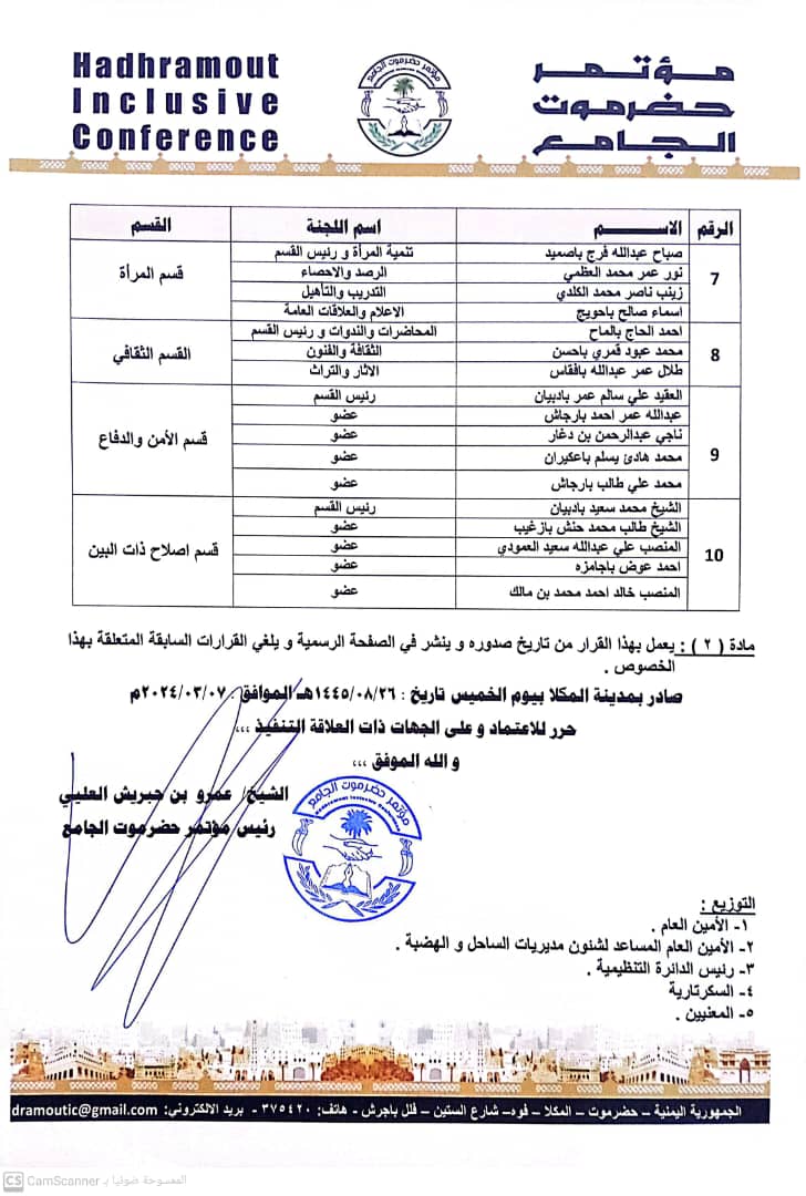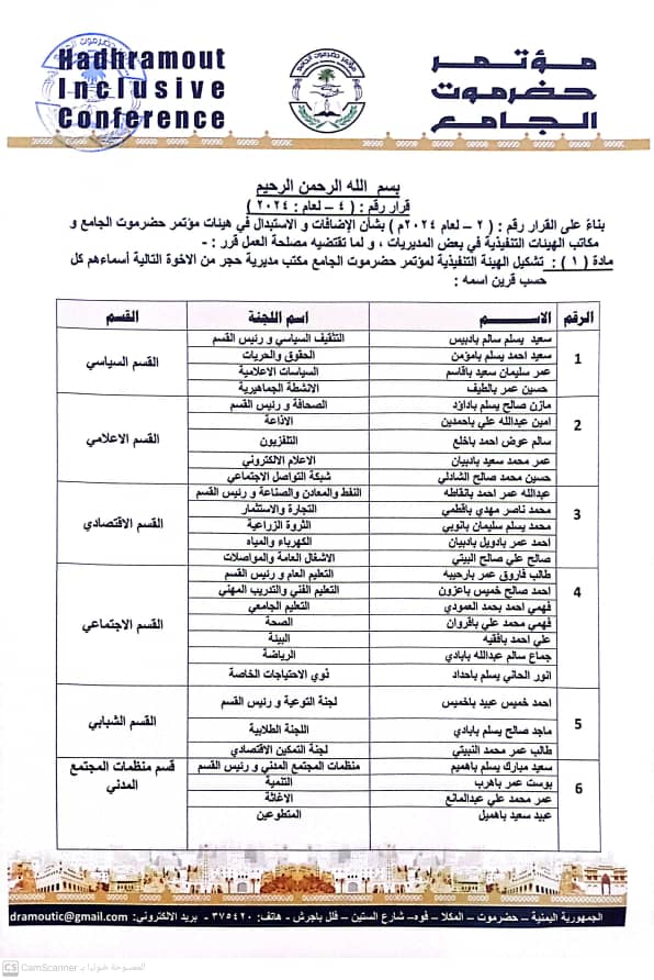أصدر رئيس مؤتمر حضرموت الجامع الشيخ عمرو بن حبريش العليي، اليوم ، القرار رقم (4) لعام 2024م , التي قضت في مادته الأولى بتشكيل الهيئة التنفيذية لمؤتمر حضرموت الجامع مكتب مديرية حجر، المكونة من (45) أسمًا تضم لجان أقسام المكتب (السياسية، والاعلامية، والاقتصادية، والاجتماعية، والشبابية، ومنظمات المجتمع المدني، والمرأة، والثقافية، والدفاع والأمن، واصلاح ذات البين).