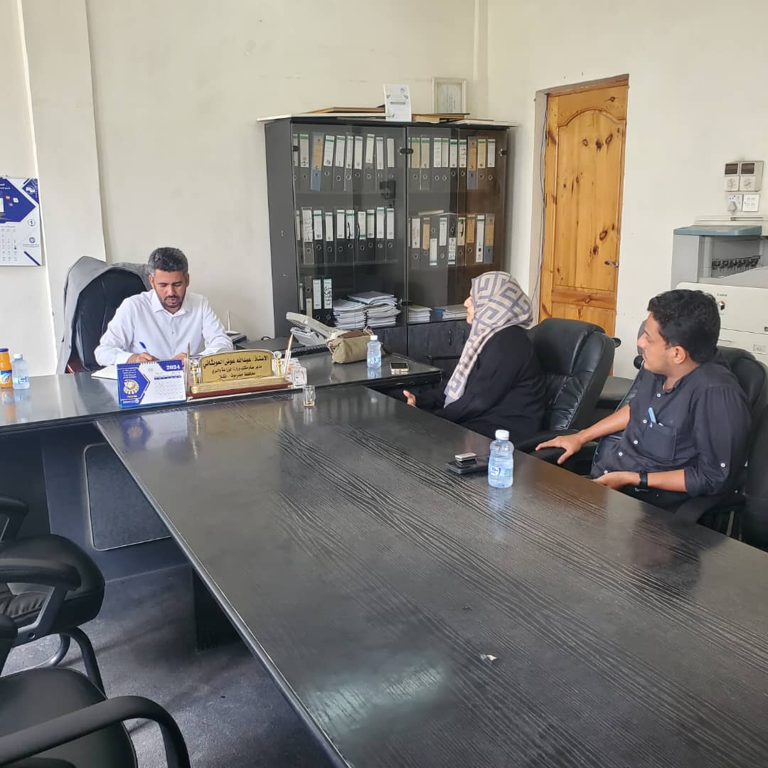 وفي نفس السياق استقبل مدير عام مكتب وزارة الزراعة والري بساحل حضرموت الأستاذ عبدالله عوض العوبثاني صباح اليوم بمكتبه الأستاذة خلود العرشي أخصائية الأمن الغذائي وسبل العيش بجمعية رعاية الأسرة، والمهندس خالد سعيد باعفي مسؤول المشاريع بجمعية رعاية الاسرة فرع حضرموت ، لبحث سبل التعاون المشترك بين الجمعية ومكتب وزارة الزراعة والري بساحل حضرموت، والتنسيق بين الطرفين لتعزيز العلاقة والشراكة فيما بينهم .
