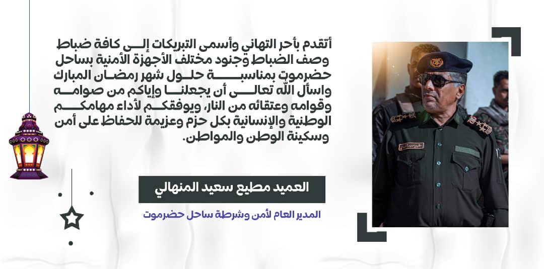 هنأ المدير العام لأمن وشرطة ساحل حضرموت، العميد مطيع سعيد المنهالي، اليوم الإثنين، ضباط وصف ضباط وأفراد الأمن والشرطة بكافة مدن ومديريات ساحل حضرموت بمناسبة حلول شهر رمضان المبارك.