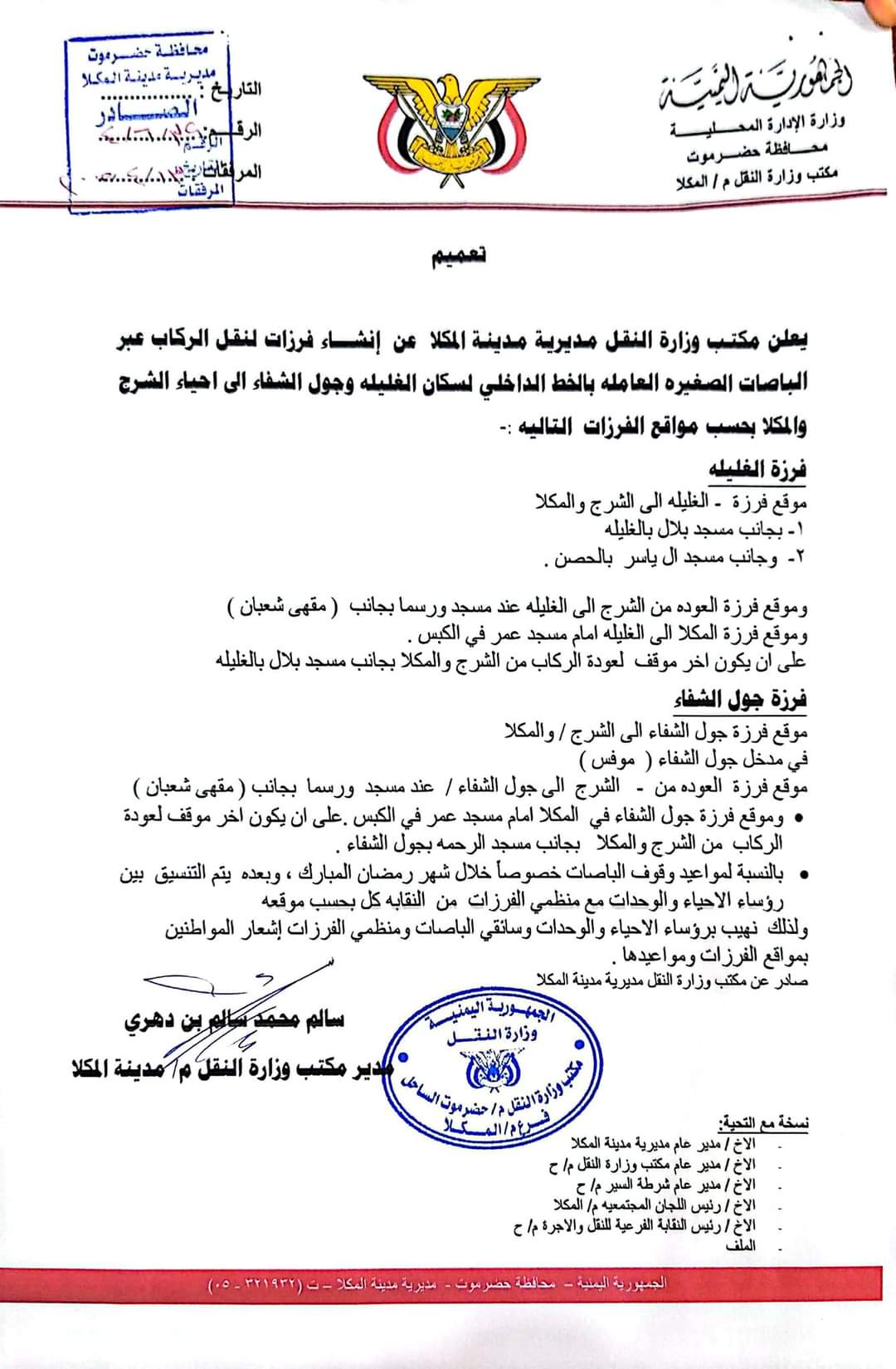 هذا ونرفق لكم بطيات هذا الخبر صورةً من قرار مكتب النقل بمديرية مدينة المكلا.