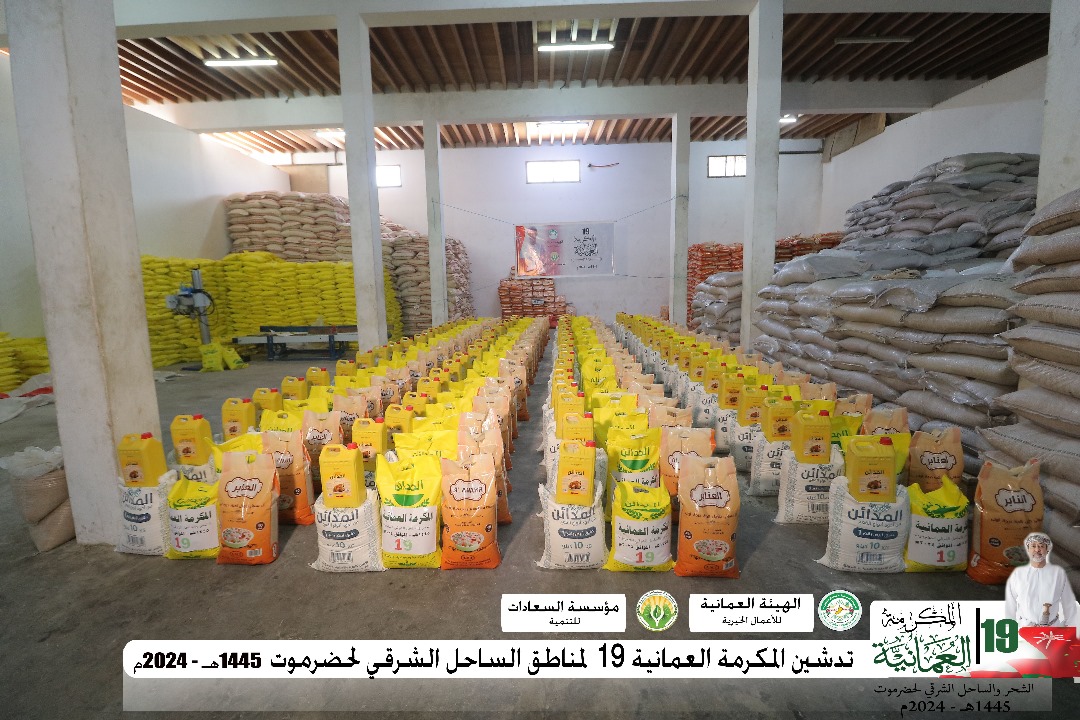 في مساء يوم الخميس 11 من رمضان لعام 1445هـ الموافق 21 / 3 / 2024م وبحضور المدير العام لمديرية الشحر الأستاذ عادل أحمد باعكابة ونائب المدير العام لمديرية الشحر الأستاذ: مصبح العبد البحسني ومدير مكتب الشؤون الاجتماعية والعمل الأستاذ محمد علي عيديد ومدير مكتب الاوقاف والارشاد الأستاذ أسامة مبارك بن نويصر، بدأت مؤسسة السعادات للتنمية بالشحر بتدشين مشروع توزيع المكرمة العمانية التاسعة عشر البالغ عددها (19200) سلة غذائية والممولة من الهيئة العمانية للأعمال الخيرية والتي تأتي كعطاء متجدد ومستمر في كل عام كعطية من جلالة السلطان هيثم بن طارق بن تيمور آل سعيد متّعه الله بدوام الصحة والعافية.