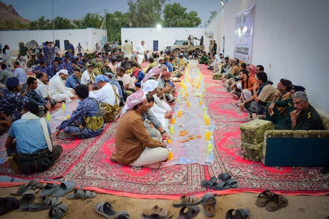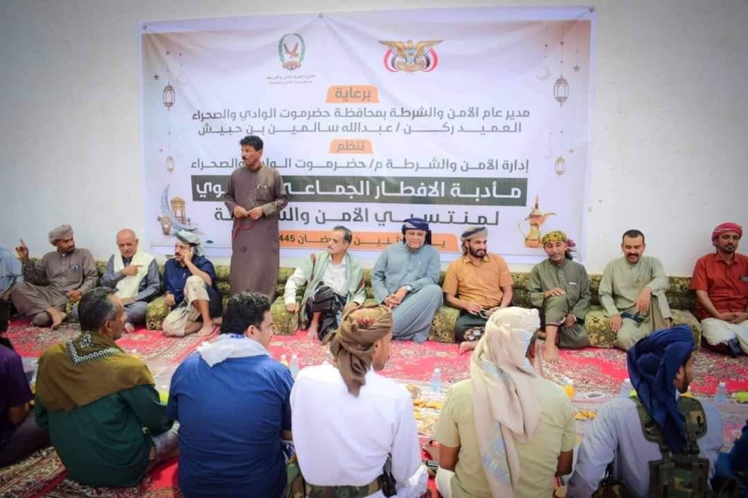 نظمت الادارة العامة للأمن والشرطة بمحافظة حضرموت الوادي والصحراء أمسية رمضانية والافطار الجماعي السنوي لمنتسبي رجال الأمن والشرطة برعاية كريمة من المدير العام العميد الركن عبدالله سالمين بن حبيش بحضور القادات الأمنية وعدد من المشائخ وعقال الحارات.