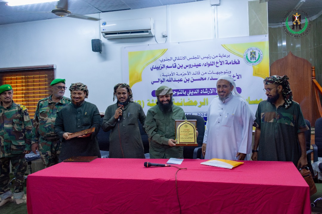 كرم القائد العام لقوات الحزام الأمني، العميد محسن عبد الله الوالي اليوم، الفائزين مسابقة قوات الحزام الأمني للقرآن الكريم وترتيله، بنسختها الثالثة، والتي نظمتها إدارة الإرشاد الديني في الإدارة العامة للتوجيه المعنوي، برعاية كريمة الرئيس القائد عيدروس الزبيدي، وإشراف مباشر من العميد الوالي
