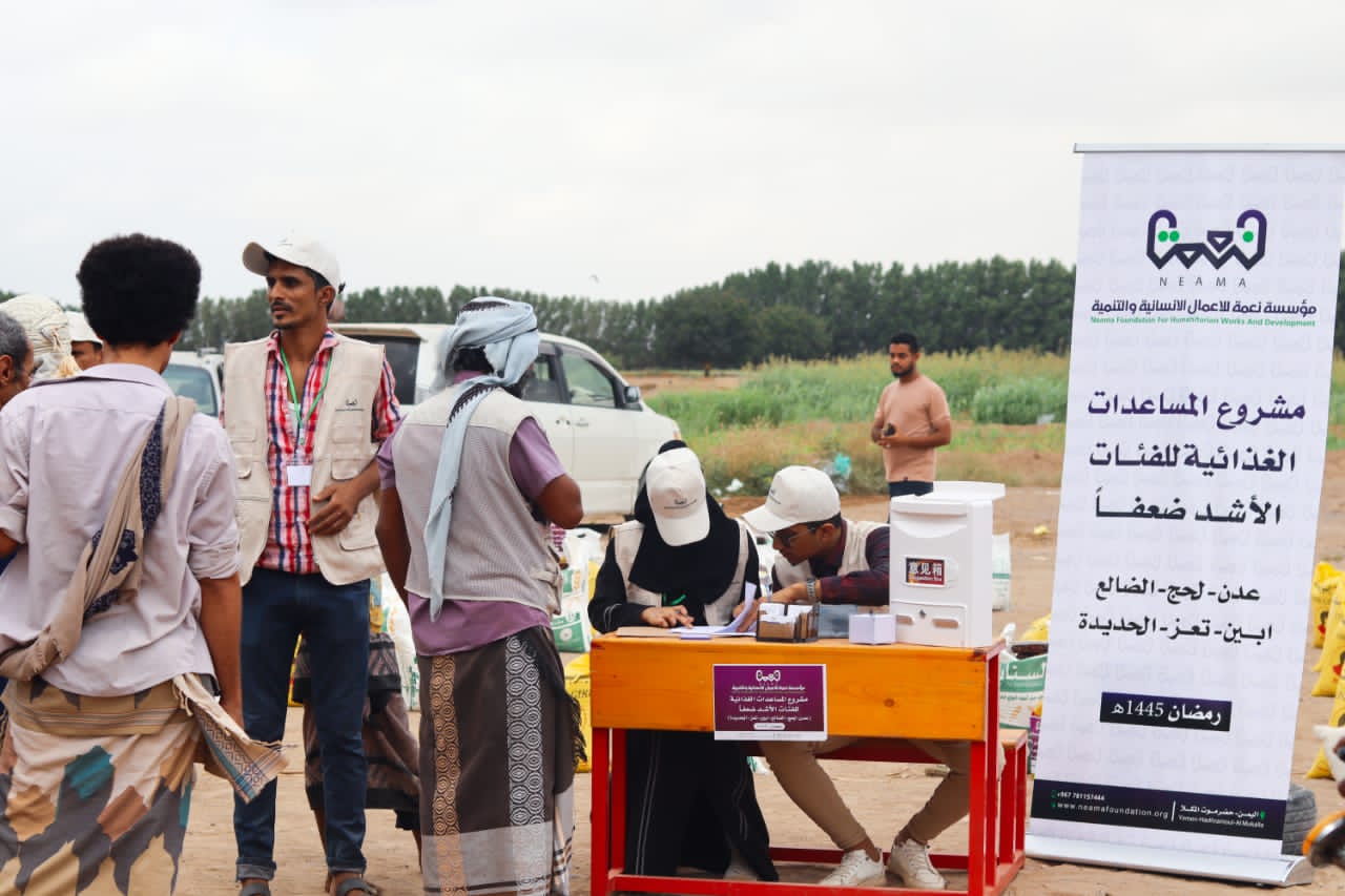 دشنت مؤسسة نعمة للاعمال الانسانية والتنمية، الاثنين مشروع السلال الغذائية للاسر الاشد فقرا في ست محافظات يمنية.