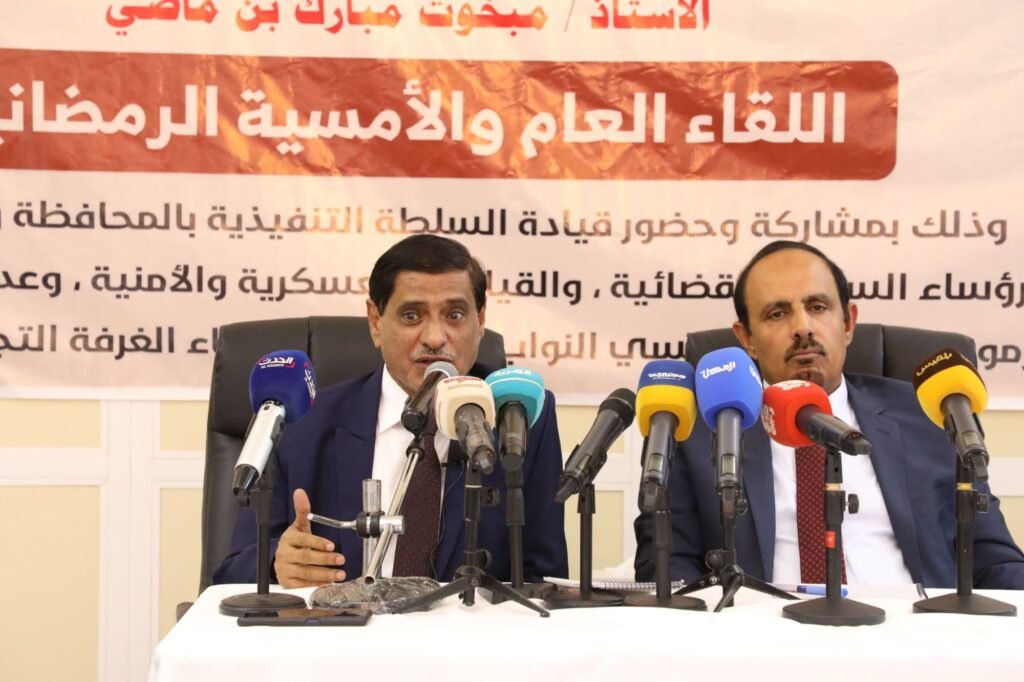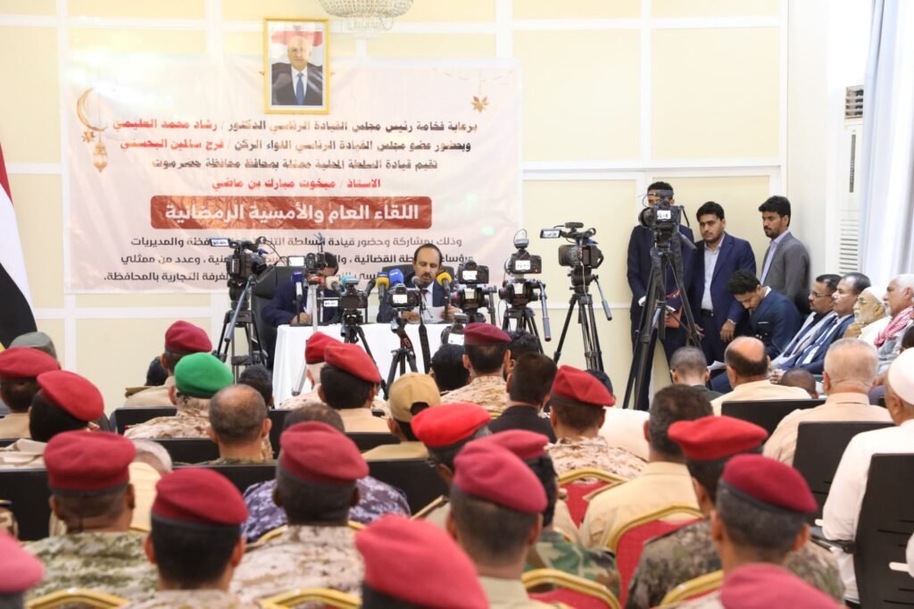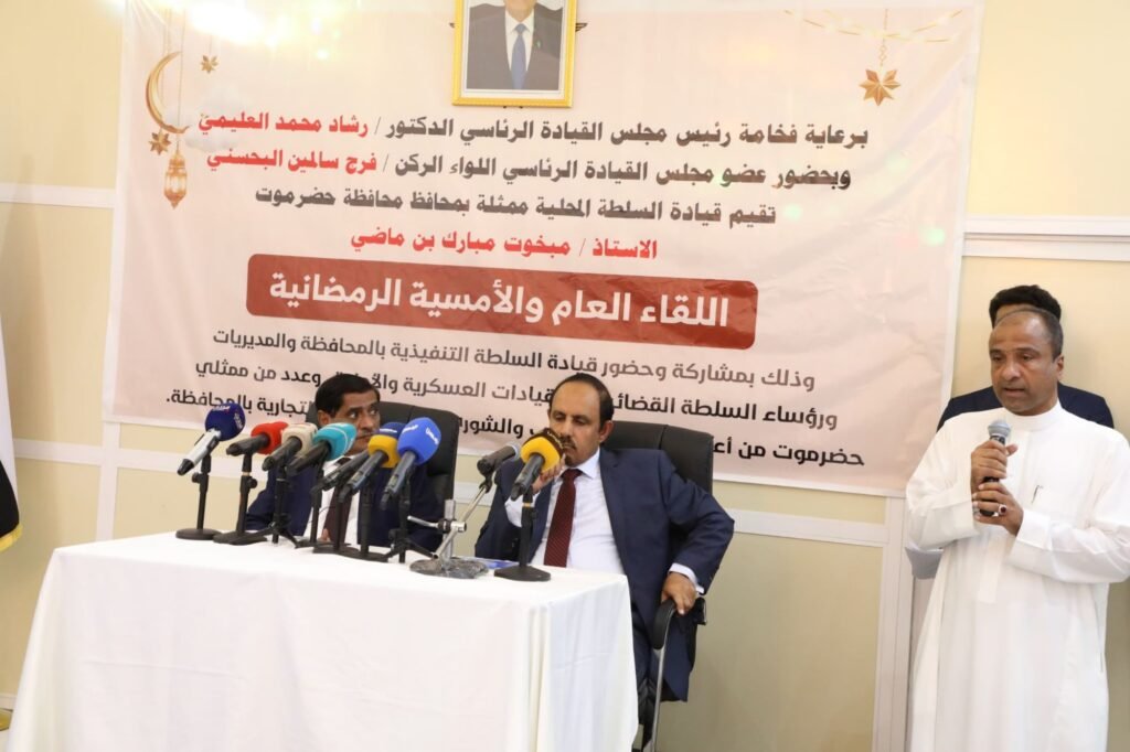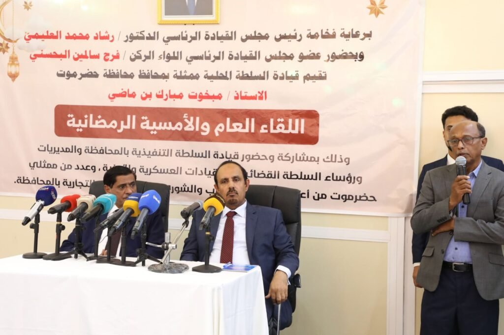 ورفع محافظ حضرموت الأستاذ مبخوت مبارك بن ماضي، التهاني للحضور ولأبناء حضرموت كافة بمناسبة خواتم شهر رمضان الكريم، مستعرضًا جهود السلطة المحلية في توحيد الصف وجمع الكلمة، وتحسين الخدمات ودعم التنمية وسط صعوبات توقف تصدير النفط وتراجع الايرادات وارتفاع العملة، التي جاءت كافرازات للحرب التي انعكست على أحوال المواطنين وأوضاعهم.