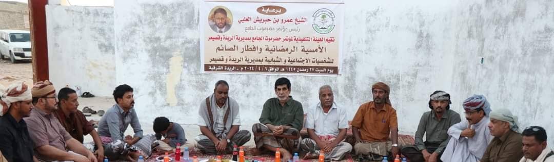 نظمت الهيئة التنفيذية لمكتب حضرموت الجامع في مديرية الريدة وقصيعر إفطار صائم جماعي وأمسية رمضانية وإفطار جماعي ، في مدينة الريدة الشرقية ، بحضور عدد من مدراء المكاتب الحكومية والشخصيات الإجتماعية والشبابية وجموع من المواطنين.